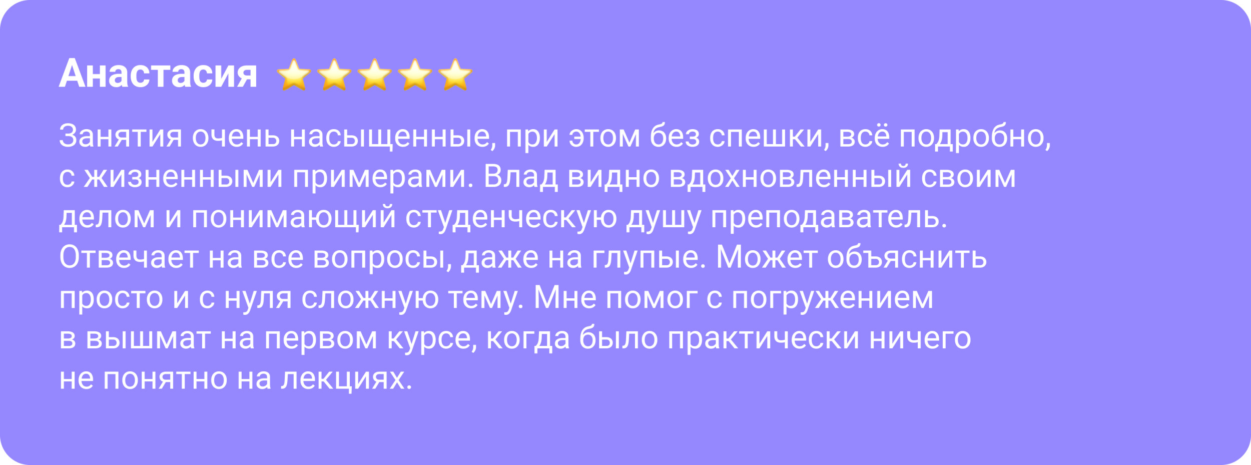 В блоке «Вышмат» 10 курсов, а ещё шпаргалки и полезные материалы с разбором теории и практики на 30+ страниц. Можно выбрать любой из них и проходить в удобном темпе. Главное, быть системным и заниматься два раза в неделю — этого достаточно, чтобы осознать материал. В каждый курс входит 👉 📗 Записанные уроки с понятной теорией и практикой — не придётся искать дополнительные источники самому, мы всё подготовили. Уроки можно смотреть, когда удобно. ✍️ Домашнее задание — идёт после каждого блока и помогает проверить себя. Если что-то непонятно, можно вернуться к уроку, а потом оценить свой результат, посмотрев видеообзор домашки от преподавателя. А ещё есть дополнительная опция на базовых предметах — чат с преподавателем и другими учениками. Там можно задавать вопросы по темам или домашке, получить поддержку и поднять мотивацию. Плюс вы попадёте в классное комьюнити единомышленников и сможете найти новых друзей! Кампус Курсы подойдут всем, кто хочет разобраться в предмете, независимо от уровня подготовки. Если сидите на парах и ничего не понимаете — объясним простым языком. Если нужно быстро подготовиться к экзамену или пересдаче — дадим чёткую структуру и разберём ключевые темы. А если интересно углубиться в предмет, мы поможем освоить сложные концепции и разберём самые нетривиальные задачи. Здесь вы получите не просто теорию, а реальное понимание и навыки, которые останутся надолго и помогут самостоятельно сдать экзамен. Отбором педагогов занимается Максим Сергунин — наш главный преподаватель со стажем 8+ лет, он окончил МГТУ им. Баумана и спас от пересдач более 1100 студентов! Максим умеет преподносить материал в очень понятной форме и знает, как эффективно и быстро подготовиться к сессии даже на самой сложной программе. Так что в нашей команде только лучшие преподаватели. Они знают, как объяснить материал, как мотивировать на обучение и заинтересовать в предмете. В среднем, цены на индивидуальные занятия с репетитором по математике начинаются от 1000 ₽ за академический час и могут достигать 3000 ₽ и больше. Только за один месяц траты могут достигать 40 000 ₽. Наша же подписка стоит 6400 ₽ на 6 месяцев, с поддержкой — 8400 ₽. Выбирай курс на сайте «Кампуса» и вперёд — покорять высшую математику 🙂