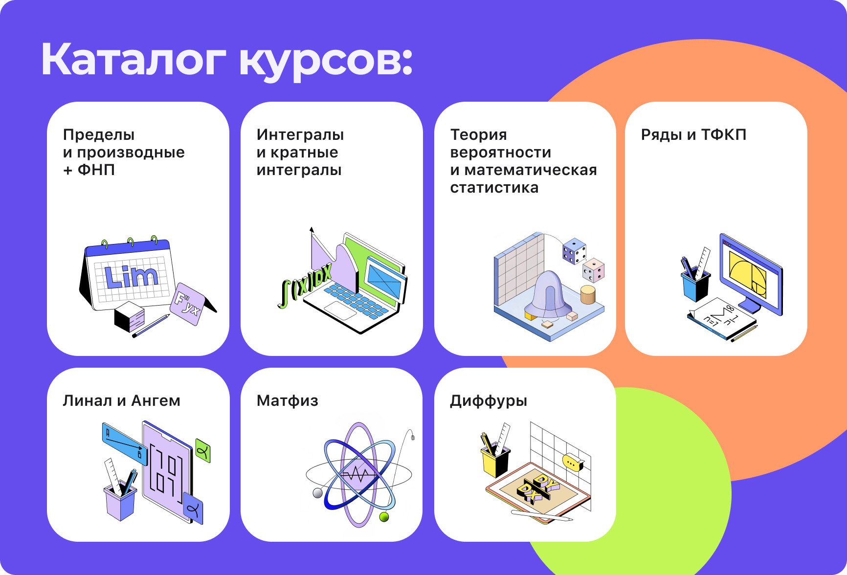 Сервис предлагает курсы по 20+ дисциплинам (пределы и производные, линал и ангем, основы С++ и др.), которые адаптированы под программы уже 100 ВУЗов, а преподаватели ежемесячно проверяют их на соответствие актуальным требованиям и добавляют новые темы при необходимости.