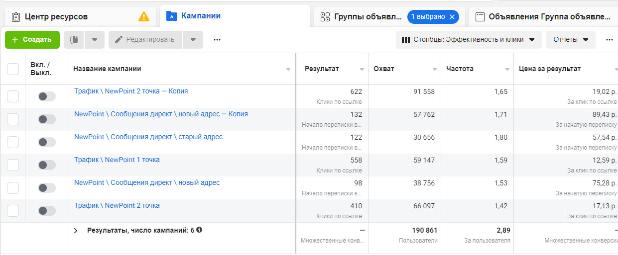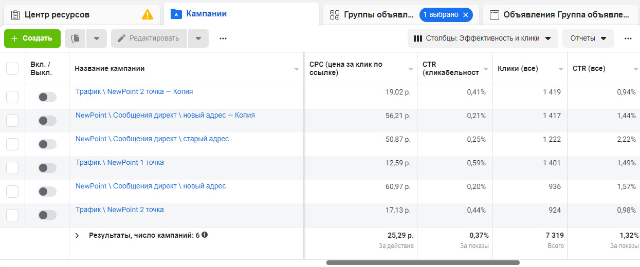 4.собственное мобильное приложение. В качестве посадочной площадки использовали профиль в Instagram и квиз, на котором собирали номера телефонов потенциальных клиентов. После создания квиза, на него установили пиксель Fb. Так как заказчику важно было привлечь новых клиентов, то при создании креативов использовали УТП со скидкой на маникюр при первом посещении. Все макеты выполнены в соответствии с брендбуком салона. Примеры наиболее кликабельных креативов: Все рекламные компании запускали через рекламный кабинет Facebook, для этого выбрали несколько форматов настройки, опираясь на возраст и гео. Скриншоты результатов первых рекламных компаний: Новую компанию вели также через сообщения в директ. Но теперь настраивались на женщин от 18 до 55 лет, проживающих и работающих в 2-3 км от салонов. Без детального таргетинга. Места размещения: ленты и истории в Instagram. Дневной бюджет распределен на уровне групп: ленты — 300 рублей, истории — 150 рублей. Объявления показывающиеся в группах ленты принесли больше результатов, поэтому на нее увеличили бюджет до 600 рублей путем дублирования компании. Группа с показами в истории была отключена. Другую компанию настраивали с целью трафик на квиз, с оптимизацией показов: клики по ссылке. Для начала, установили дневной бюджет в 350 рублей. Аудиторию оставили прежней, внеся небольшие изменения: 2.Расширили гео до 4-5 км от салона. Также, отдельно запустили трафик на салон, находящийся в центре. Увеличив площадь до 6 км от салона. Следующую компанию запустили аналогично первой изменив лишь креативы. Скриншоты результатов новых рекламных компаний: В день CTR мог достигать до 5,34%: За последние 2 месяца работы было собрано 924 заявки, по средней стоимости — 82,16 рубля. Общий CTR (переход из показа в клики) составляет 1,53%. Максимальное количество заявок в день — 34 шт, по 38 рублей.