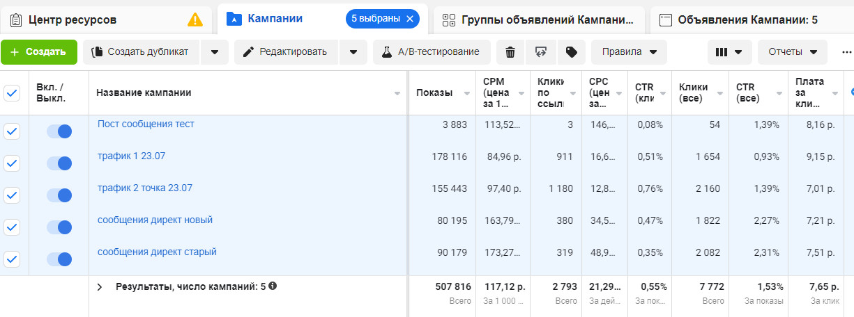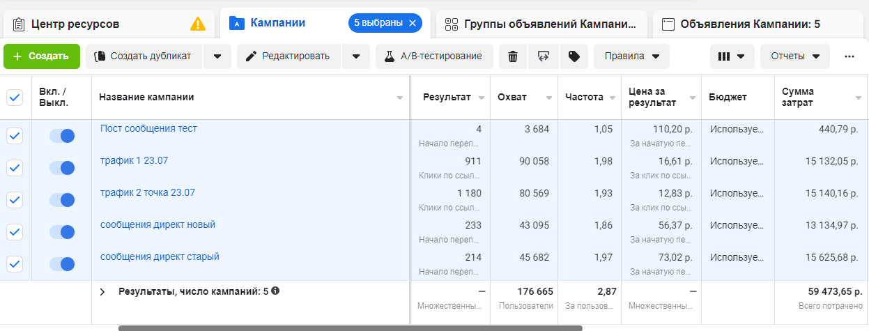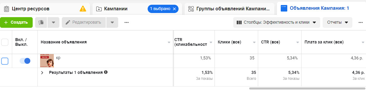 Первые рекламные компании принесли 718 лидов. Общий CTR — 1,32%. Со временем этот показатель стал падать, в связи с чем мы приступили к масштабированию связок: заменив креативы, увеличив возрастной диапазон и бюджет.