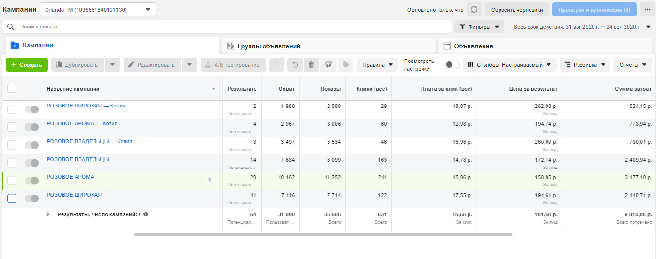 Было составлено около 10 баннеров, но самым конверсионным стал этот креатив: Реклама была запущена на Instagram и Facebook. Лучше всего показал себя Instagram. Объявления запускались на аудитории: 1.Широкая, Россия исключая: Москву, Санкт-Петербург, Московскую область; 2.Широкая: Москва, Санкт-Петербург, МО; 3.Широкая, Россия исключая: Москву, Санкт-Петербург, Московскую область; Интересы: Ароматерапия, эфирные масла, ароматы; 4.Широкая: Москва, Санкт-петербург, МО ; Интересы: Ароматерапия, эфирные масла, ароматы; 5.Широкая: Москва, Санкт-петербург, МО ; Интересы: основатель / владелец; 6.Широкая, Россия исключая: Москву, Санкт-Петербург, Московскую область; Интересы: основатель / владелец. Лучше всего себя показала связка " Широкая, Россия исключая: Москву, Санкт-Петербург, Московскую область; Интересы: Ароматерапия, эфирные масла, ароматы". Как только обнаружили нужные связки, начали их масштабировать. Нам было предоставлено 10 000 рублей на месяц. За месяц мы потратили 9 810 рублей. Вот таких результатов мы добились: Охват — 31 080 Показы — 35 605 Клики по ссылке — 631 Количество заявок с лид-формы — 61 (Avg. CPL = 413,20 руб) Общее кол-во лидов: 61 Средняя стоимость заявки: 160,8 руб.
