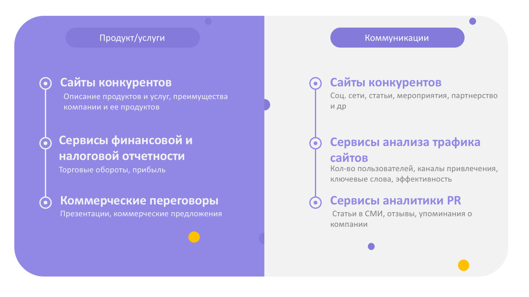 6) Как итог — создать или обновить маркетинговую стратегию и тактику!Представить руководству аргументы продаж, способы донесения ценности продукта/услуги до клиента, создать контент-план и представить исчерпывающие маркетинговые и коммерческие материалы для отдела продаж. Ниже представлен список и последовательность действий, совершив которые, вы получите полное представление о том, в чем именно ценность вашего продукта или услуги, а также как эту ценность донести до целевой аудитории!Как сделать анализ конкурентов. Подробная инструкция с примерами графиков и сравнительных таблиц: Блок 1: Подготовка 1) Зафиксировать цели анализа конкурентов 2) Определить объект анализа и критерии сравнения с конкурентами 3) Произвести отбор конкурентов для анализа 4) Подобрать источники данных для анализа Блок 2: Конкурентные преимущества продукта/услуги 5) Оценить динамику продаж и финансовых результатов компаний конкурентов 6) Составить портфолио клиентов конкурентов 7) Оценить структуру компании и ее ресурсы 8) Составить сравнительную таблицу по продуктам и услугам 9) Сравнить цены, состав цены и размер скидки, а также бонусы 10) Составить карту ценностей продукта/услуги Блок 3: Каналы и инструменты привлечения и удержания клиентов 11) Каналы привлечения целевой аудитории 12) Определить инструменты коммуникации 13) Комплексный анализ сайта 14) Активность в социальных сетях 15) Анализ PR активностей компаний конкурентов 16) Составить карту коммуникаций Блок 4: Проверка карты ценностей и коммуникаций на клиентах 17) Составить 5-7 вопросов своим и потенциальным клиентам для проверки актуальности найденных преимуществ и способов их донесения до клиента 18) Провести опрос-глубинное интервью с клиентами 19) Составить финальную карту преимуществ компании/продукта и план маркетинговых коммуникаций Как говорится —"что посеешь, то и пожнешь". На этапе подготовки важно четко определить зачем проводится исследование, кто является конкурентом и критерии оценки! Например, если цель разработка маркетинговой стратегии, то, скорее всего, в качестве конкурентов будут обозначены лидеры рынка. А если цель предполагает также определение угроз и возможностей, то в качестве конкурентов также будут добавлены и новые игроки, смежные по услугам компании, стартапы. А если стоит задача выйти на новые географические рынки, то и вовсе предполагают дополнительную работу по поиску этих конкурентов, ведь изначально мы даже не знаем кто наши конкуренты.Вот самые часто встречаемые в бизнесе цели исследования конкурентов: Так или иначе, анализ конкурентов — это сравнение по идентичным показателям: А) продукты и услуги Сравнение можно производить строго по одному продукту или услуге, равно как и по всей линейке предлагаемых решений.Зачастую комплексность и связка одного продукта с другим является преимуществом для клиентов. Поэтому, исходя из специфики вашего продукта или услуги, оцените целесообразность сужаться до конкретного функционала лишь одного продукта. Б) Бренд (узнаваемость, лояльность) В) Коммуникации, то есть оценка инструментов привлечения клиентов Также на данном этапе необходимо согласовать критерии, по которым будет произведено сравнение. ВАЖНО:Необходимо уйти от общих формулировок в сторону конкретных параметров:Вместо просто — сравнить функциона