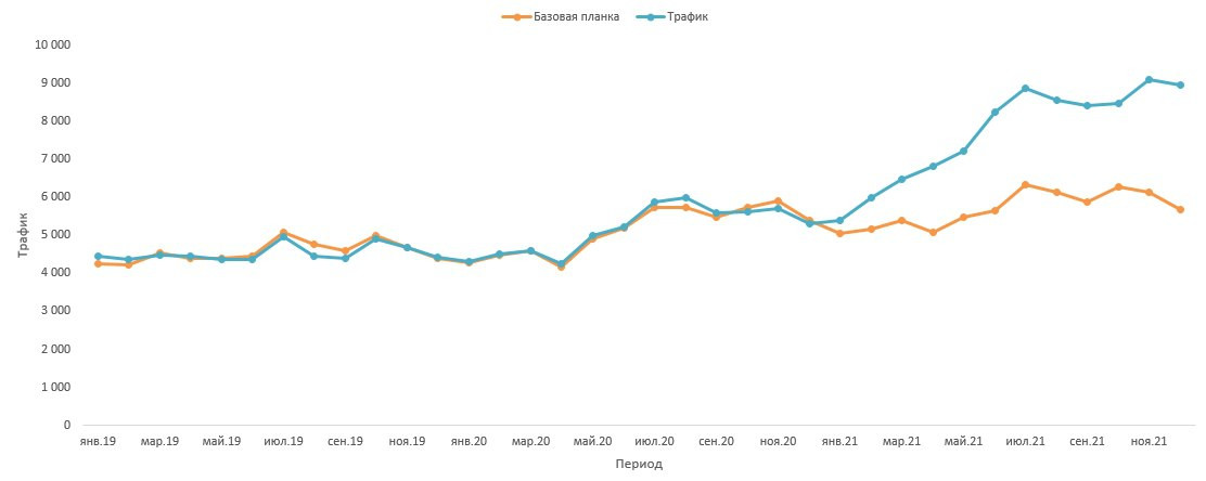 Правда, тут есть одно «но». Чтобы корректно рассчитать прирост, который сайт получал бы со временем без нашей помощи, звезды должны совпасть так, чтобы его не продвигали ранее и при этом по нему была накоплена статистика хотя бы за предыдущие пару лет. В общем, такое бывает чуть чаще, чем никогда. В этих исключительных случаях мы берем все данные, находим аномалии, избавляемся от них, накладываем сезонность и уверенно прогнозируем базовую планку с помощью линии тренда.