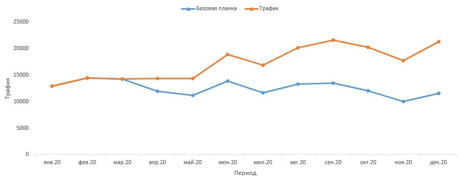 Если клиент хочет продвигаться с оплатой за трафик, мы рассчитываем для его проекта базовую планку — какой объем трафика он уже получает и получал бы дальше без нас. За этот объем клиент не платит.