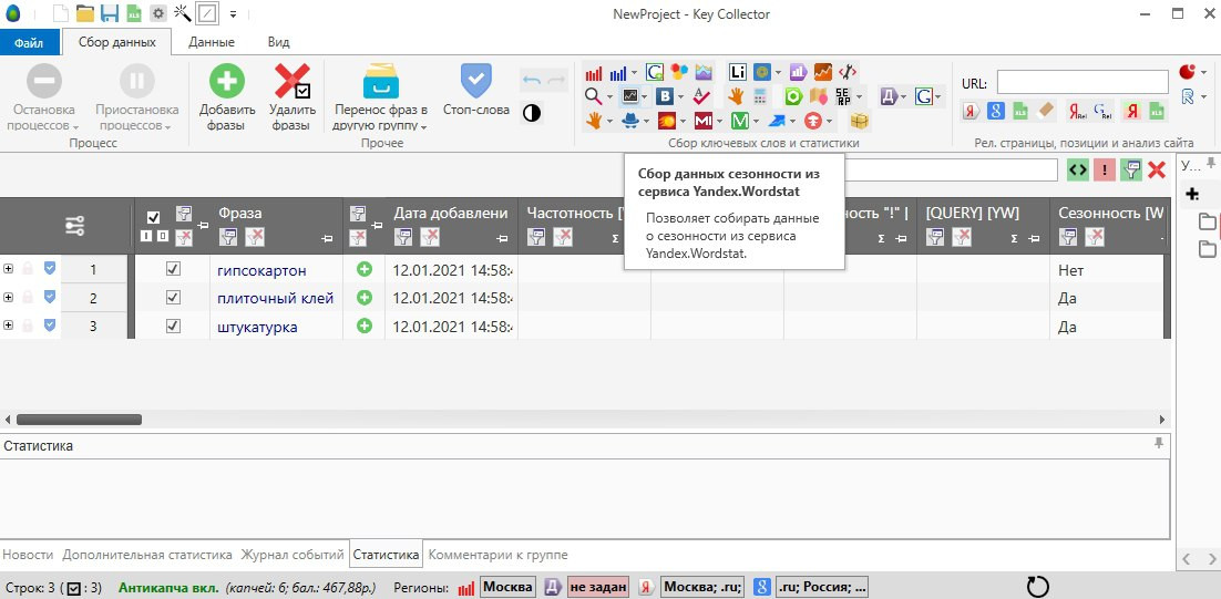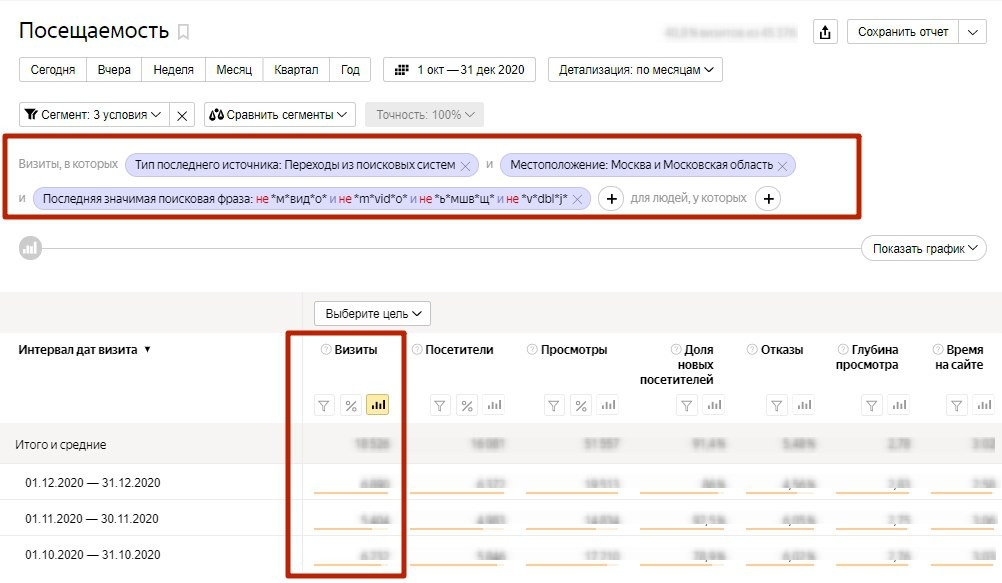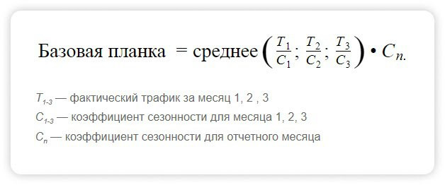 Когда же таких стартовых условий нет (а это почти всегда), мы для расчета базовой планки используем формулу: Рассчитанная таким способом базовая планка не растет со временем, но учитывает сезонные изменения трафика. Это значит, что в высокий сезон клиент не будет переплачивать за тот трафик, который вырос естественным путем, а в низкий сезон наше агентство не будет нести убытки из-за естественного снижения трафика. В общем, справедливо. А теперь — подробнее о том, откуда мы берем значения, которые подставляем потом в формулу выше: как определяем чистый органический трафик за 3 месяца и как рассчитываем коэффициент сезонности для каждого месяца. Это те самые значения Т1 (трафик за первый месяц), Т2 (трафик за второй месяц) и Т3 (трафик за третий месяц). Чтобы их определить, мы заходим в Яндекс.Метрику: Отчеты → Стандартные отчеты → Посещаемость и убираем из отчета: В итоге получаем такой отчет — в столбце «Интервал дат визита» задаем первый, второй и третий месяцы, а из столбца «Визиты» берем значения Т1, Т2 и Т3: Этот отчет мы используем для расчета не только базовой планки, но и прироста трафика за счет продвижения. Это значения С1 (коэффициент сезонности для первого месяца), С2 (коэффициент сезонности для второго месяца, С3 (коэффициент сезонности для третьего месяца). Чтобы их рассчитать, нам нужно знать суммарную частотность фраз за месяц и среднемесячную суммарную частотность фраз за год. Сначала мы выгружаем данные о сезонности якорных запросов. В качестве якорных запросов мы берем категории товаров: гипсокартон, штукатурка, плиточный клей, например. В итоге получаем таблицу, в которой сведены запросы и их частотность за каждый месяц. Складываем частотность всех запросов в одном столбце — получаем суммарную частотность фраз за месяц (числитель в нашей формуле). Складываем суммарную частотность фраз за каждый из 12 месяцев друг с другом и делим это значение на 12 — получаем среднемесячную суммарную частотность фраз за год (знаменатель в нашей формуле). Подставляем числитель и знаменатель в формулу и получаем коэффициент сезонности. Теперь у нас есть все значения для расчета. Напомним формулу: Сначала делим трафик за месяц на коэффициент сезонности за тот же месяц — так мы очищаем этот трафик от сезонности. Делаем это для каждого из трех месяцев. Далее находим среднее значение этих показателей — так мы получаем базовую планку без учета сезонности. Теперь умножаем это среднее значение на коэффициент отчетного месяца — так мы рассчитываем базовую планку с учетом сезонности. Если базовая планка без учета сезонности — 4000 сеансов, а в мае коэффициент сезонности составляет 1,3%, то, умножив эти значения друг на друга, мы получаем 5200 сеансов — за этот трафик в мае клиент не должен нам платить. То есть с помощью такого расчета мы помогаем ему в этом месяце сохранить бюджет за 1200 сеансов. В год — это уже десятки тысяч сеансов, а на некоторых проектах — и миллионы. Такое тщательное прогнозирование позволяет нам наиболее точно отделять естественный SEO-трафик от прироста, обеспеченного усилиями нашего агентства, а значит, и наиболее разумно расходовать бюджет клиента.