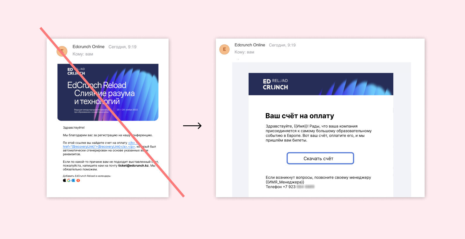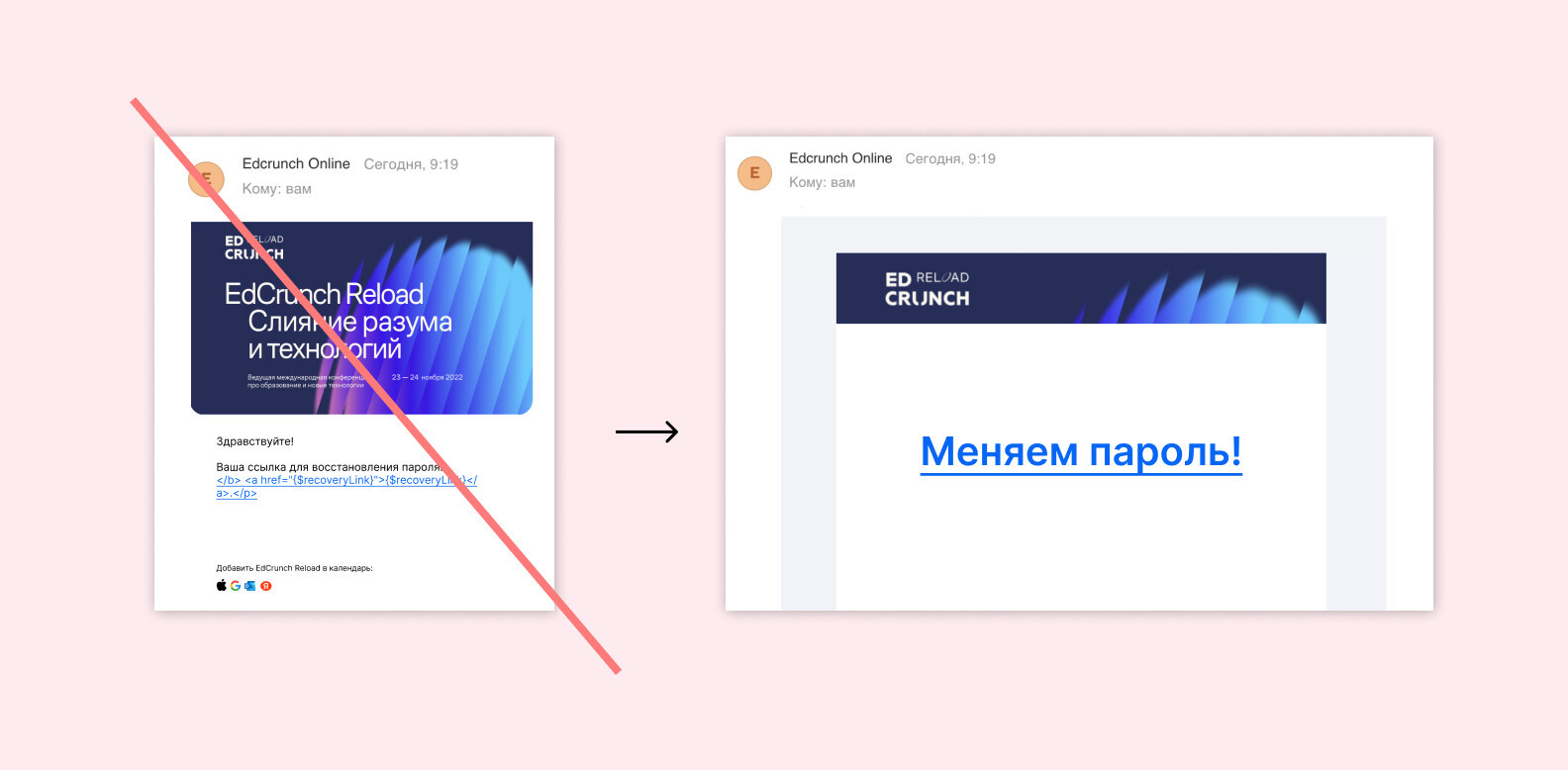 Ваша ссылка для подтверждения регистрации↓ Тема и целевое действие тоже связаны синтаксически. Читатель видит в теме «Подтвердите регистрацию. Это вы?», а в теле заметную кнопку «Это я!». В более сложных письмах заголовок лучше оставлять, чтобы письмо воспринималось целостно в отрыве от темы письма. Тут заголовок вообще не нужен. Читатель с одного взгляда понимает, какое целевое действие от него требуется. А если нет, то прочитает короткий поясняющий текст, который синтаксически связан с кнопкой. Посмотрите на письмо и удалите всё, что удаляется без потери смысла. Чаще всего это приветствие, красивые, но бесполезные обложки, виджеты или ссылки на соцсети. Читатель хочет сменить пароль и ждёт письмо со ссылкой, ему незачем сейчас идти в соцсети. Наверное, можно написать какую-то подводку. Но, зная читательскую ситуацию понятно, что он нужна скорее по традиции, чем для решения задачи. А от обложки остался один логотип, чтобы наглядно сохранить преемственность. Это письмо тоже отправляется автоматически, но после верификации менеджера. В отличие от остальных оно приходит не сразу, а через полчаса, и в нём есть переменная с именем личного менеджера. Поэтому тут можно мимикрировать под персональное письмо: поздороваться, похвалить, назвать по имени. Ну вот и всё. Такие посты пишутся, чтобы подписались на Телеграм-канал, поэтому:Подтвердите свою подписку на Телеграм-канал по ссылке Оставляйте заявку на нашем сайте → klmnt.online
