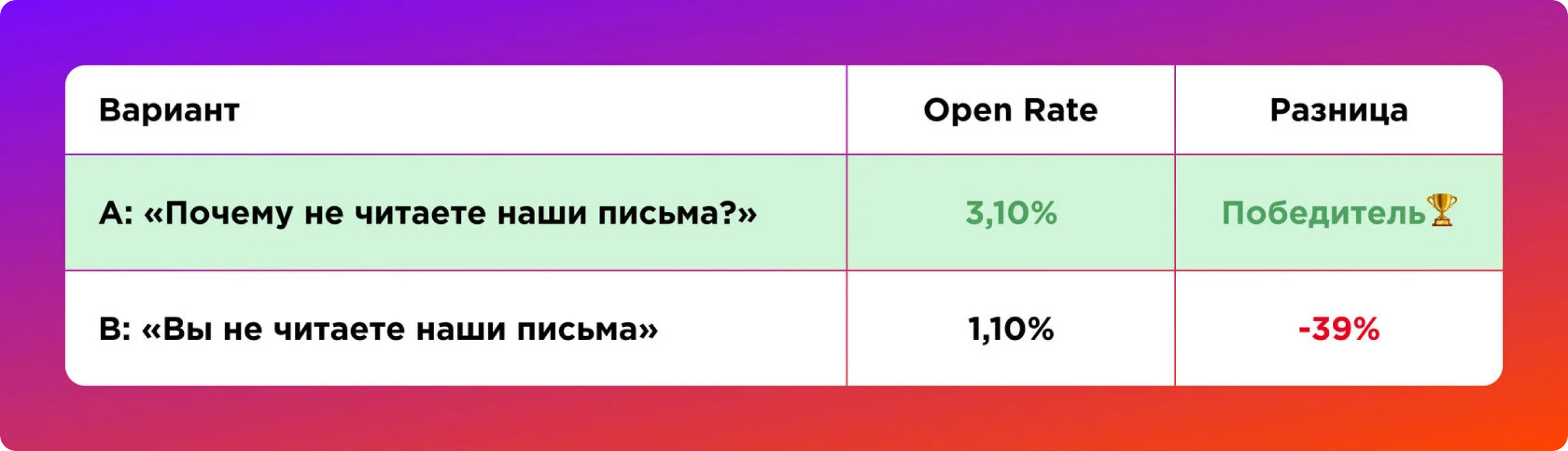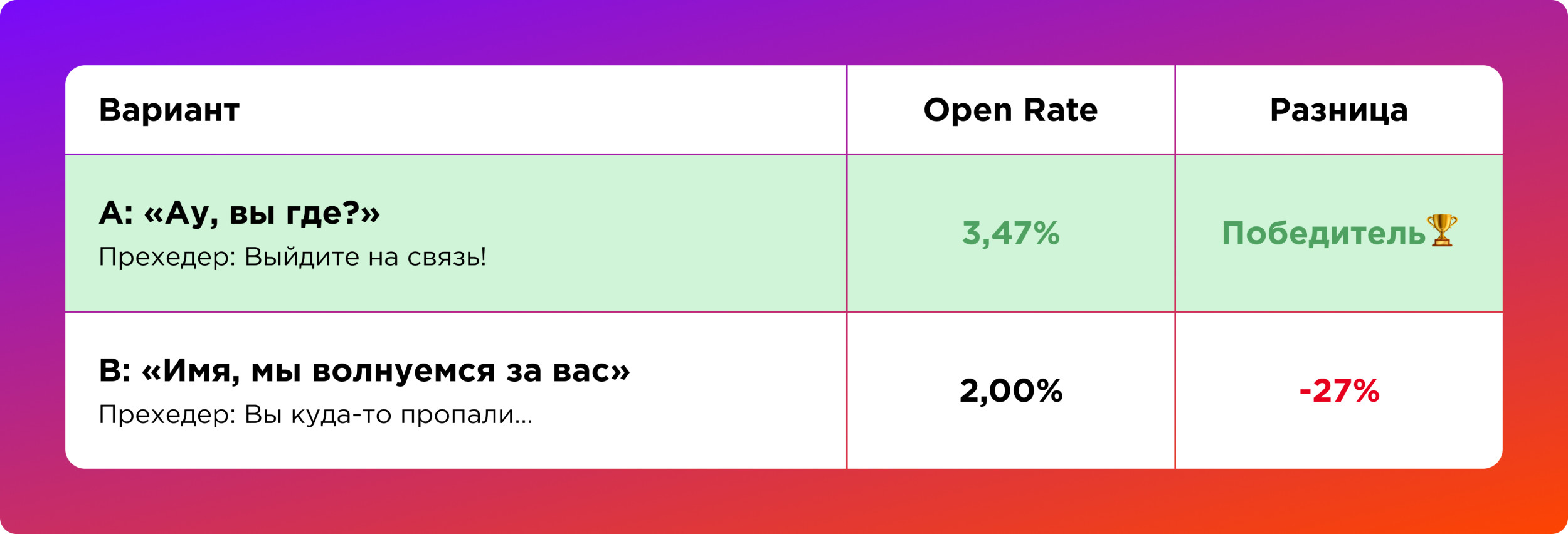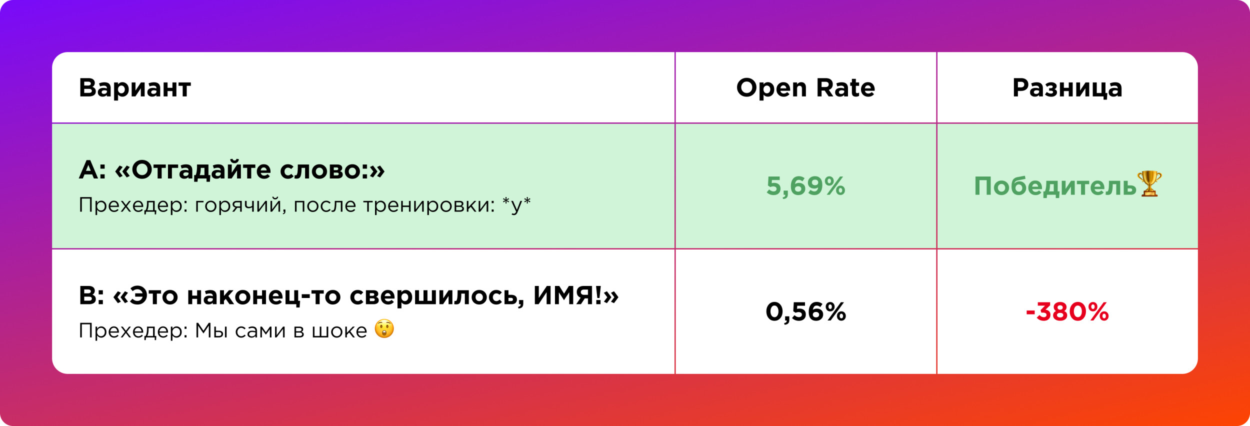 Тест 1: Загадка vs Интрига Как вы поняли, это не просто загадка, а контролируемая провокация. Большинство получателей, увидев эту комбинацию, подумали о тот самом слове из трёх букв. И получить такое от бренда вызывает любопытство и желание проверить — «неужели они реально это написали?» А внутри письма — невинный ответ: Почему это работает. Механика здесь многослойная. Фитнес-клуб и «такое» слово — это разрыв шаблона, несоответствие, которое мозг не может проигнорировать. Загадка без ответа вызывает почти физический дискомфорт, потому что незавершённый гештальт требует завершения — нужно узнать, что там внутри. При этом двусмысленность рождается в голове читателя, а не в самом письме, так что юридически и репутационно мы просто спросили про душ. А когда человек открывает письмо и понимает подвох, он улыбается — и эта позитивная эмоция связывается с брендом. Тест 2: Короткая тема vs Длинная Тест 3: Вопрос vs Утверждение Вопреки популярному мнению, эмодзи в темах и прехедерах показали худшие результаты: Письма без эмодзи открывались в 2,6 раза чаще. Возможная причина: эмодзи ассоциируются со спамом и маркетинговыми рассылками, которые пользователи привыкли игнорировать. Использование имени в теме («ИМЯ, ...») показало обратный эффект: Письма без имени открывались в 2,2 раза чаще. Гипотеза: для «холодной» базы персонализация воспринимается как манипуляция, а не забота. Наличие продуманного прехедера повышало открываемость: Прирост +41% только за счёт прехедера. Тема и прехедер должны работать в паре, дополняя друг друга. ЧК (5,69%) — действующие клиенты с активным абонементом. Лучший отклик объясняется не «теплотой» к рассылкам, а доверием к бренду: они уже платят клубу и знают его. Просто перестали замечать письма в потоке инбокс. Правильная тема возвращает их внимание. Мёртвые (1,96%) — выше, чем бывшие клиенты! Парадокс: полностью «мёртвый» сегмент реагирует лучше, чем те, кто сознательно отказался от абонемента. Вероятно, «мёртвые» просто забыли о рассылке, а не имеют негатива к бренду. ПЧК (1,90%) — потенциальные клиенты, которые никогда не покупали. Низкий отклик логичен: слабая эмоциональная связь с брендом. Они интересовались, но ещё не стали частью клуба. БЧК (1,55%) — бывшие члены клуба, худший результат. Самый сложный сегмент. Эти люди сознательно ушли от бренда — возможно, из-за негативного опыта, потери интереса к фитнесу или перехода к конкурентам. Они не просто «забыли» — они приняли решение уйти. Возвращать их сложнее всего. На основе тестов мы выявили 4 типа тем с максимальной конверсией: Напишите нам — проведём аудит и разработаем стратегию реактивации. Задача сделана совместно с агентством Out of Cloud — спасибо коллегам за сборку, дизайн, отправку и сбор статистики.