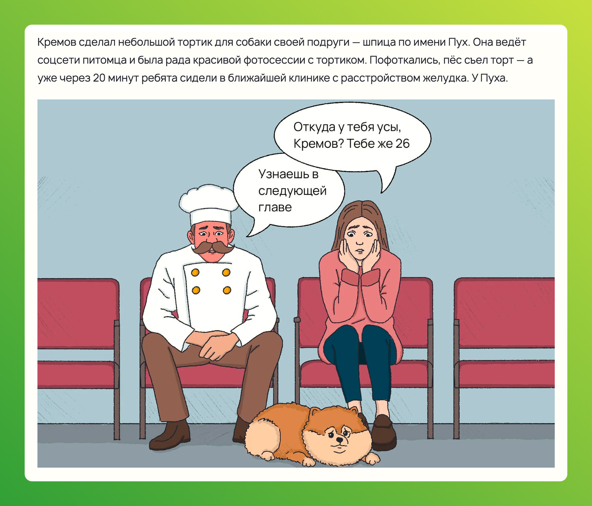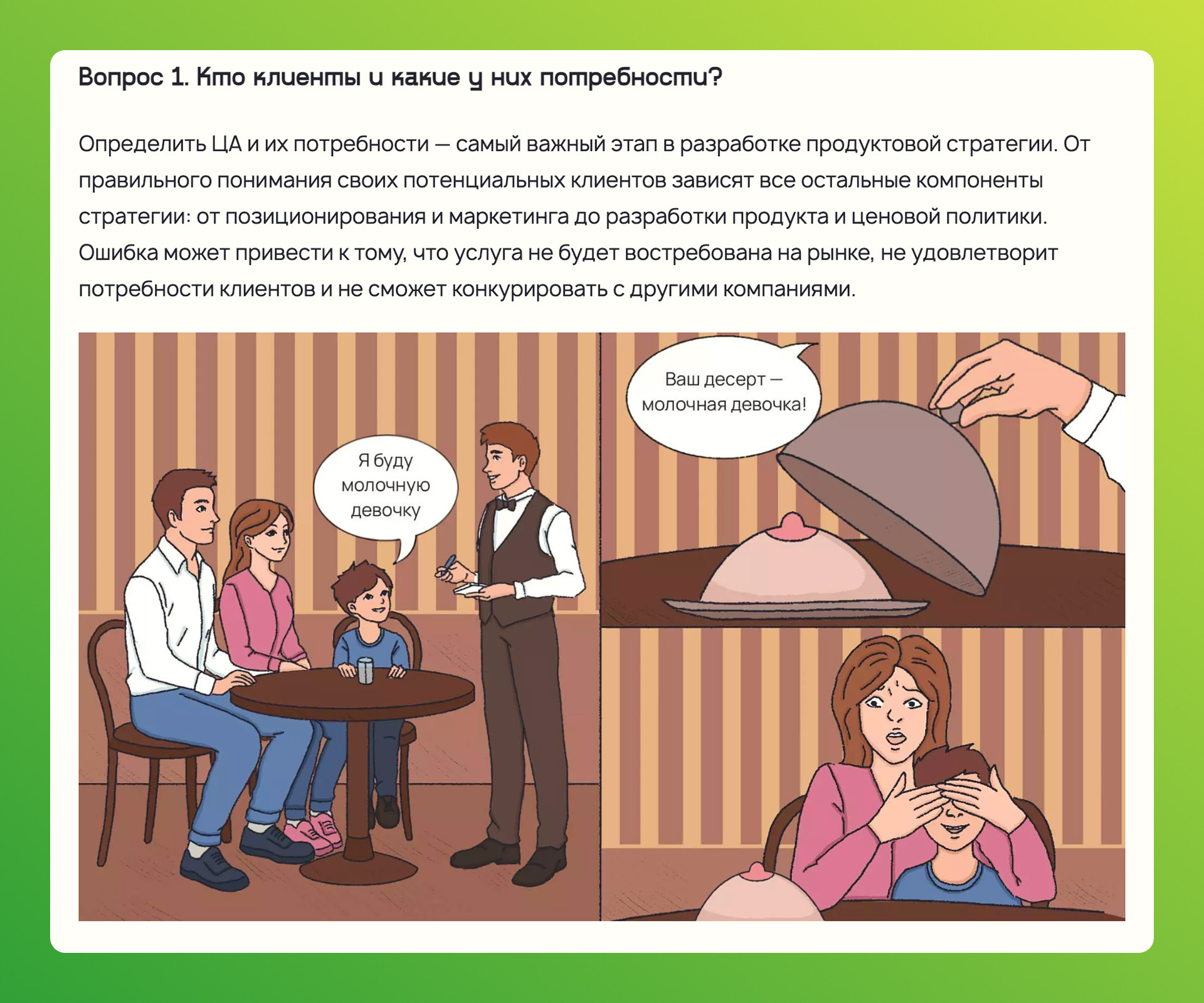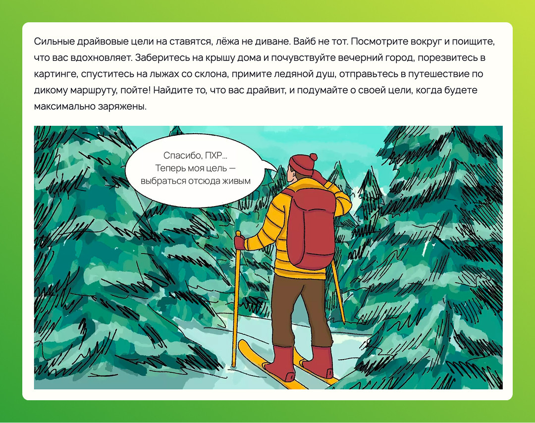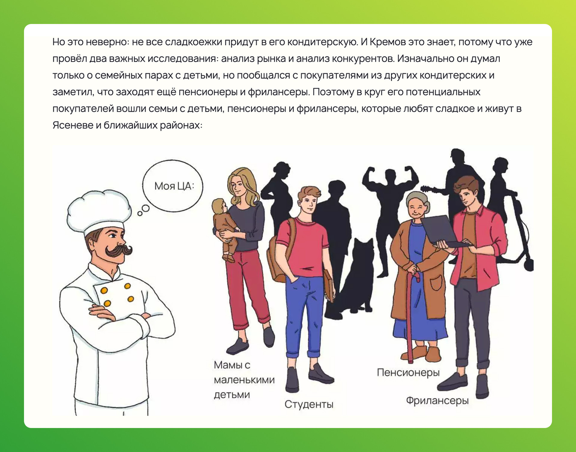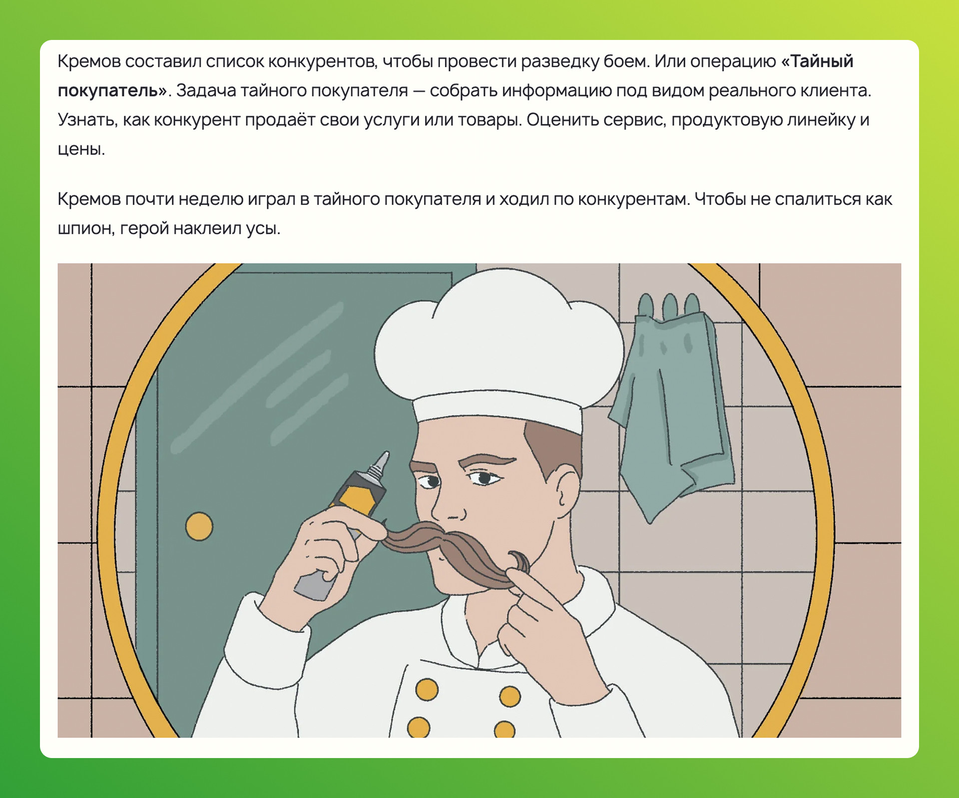 Вот темы статей по порядку: Команда. Над проектом работали 8 человек: 5 авторов, 2 редактора, иллюстратор, корректор и сеошник. Каждая статья проходила полный цикл: сбор фактуры с экспертом, написание, редактура, иллюстрации, корректура, SEO-оптимизация. Работа с экспертами. Часть экспертов давал клиент, часть находили сами. Среди них — руководитель направления инвестиций акселераторов Сбера, налоговый консультант с 17-летним опытом, директор по развитию финансовой компании, основатели исследовательских агентств. С каждым экспертом созванивались по видео, собирали фактуру, потом согласовывали готовый текст. Это важно: статьи не пересказывают первые ссылки из гугла, а на примере главного героя рассказывают реальный опыт людей, которые разбираются в теме. Сквозной герой. Мы придумали персонажа — Кремова, молодого кондитера, который мечтает открыть свою кондитерскую. Кремов — не просто иллюстрация к теории. Он ошибается, сомневается, учится на своих косяках. Когда читатель видит, как Кремов чуть не открыл кондитерскую в бизнес-центре, где люди хотят борщ, а не эклеры — это запоминается лучше любого списка «10 ошибок начинающего предпринимателя». Иллюстрации. Иллюстратор рисовал Кремова и визуализировал сложные концепции. Картинки не декоративные — они наглядно объясняют сложный материал или помогают раскрыть историю. Иллюстрация — мощная штука. Самое любимое, когда иллюстрация не только повышает понимаемость текста, но и развлекает читателя одновременно. Такое всегда врезается в память и лучше запоминается. Иногда иллюстрация помогает донести банальную мысль, которую текстом доносить либо избыточно, либо слишком наивно. А иллюстрацией — ёмко, комично и убедительно: А иногда просто развлекали читателя юмором с помощью картинок. Например, в статье «Как ставить цели в бизнесе, чтобы легко достигать выдающихся результатов»: Писали живым языком, бойко, без канцелярита, местами провокационно. «Боже, как же я затрахался, пора нанимать персонал, иначе вместо отпуска поеду в крематорий» — это реальная цитата из статьи про найм. На такие смелости изначально дал разрешение клиент, и мы его выдержали во всех 19 материалах. За 2 месяца написали 19 статей. Каждая — полноценный лонгрид с экспертной фактурой, примерами, иллюстрациями и SEO-оптимизацией. Статьи опубликованы на сайте «По ходу разберёмся», но закрыты от поисковиков. Доступ к ним только через телеграм-бота, где продаётся курс. Стоимость курса — 4 590 рублей. В первый день продаж курс купили 37 человек. Телеграм-бота разрабатывала другая команда — мы отвечали только за контент. Руфат Валиуллин, главный редактор «По ходу разберёмся»: «Делал большой спецпроект с Климентом и его ребятами — отличное агентство. Пишут классные, живые статьи, придумывают смешной, цепляющий визуал. Сроки не продалбывают, а если что-то идёт не так — предупреждают и предлагают вариант решения. Всегда идут навстречу и горят проектом. В общем, получил полноценный кайф от сотрудничества с Климентом». 100+ клиентов: S7, Spirit. Fitness, Яндекс. Практикум, Exponenta, Финтабло и другие