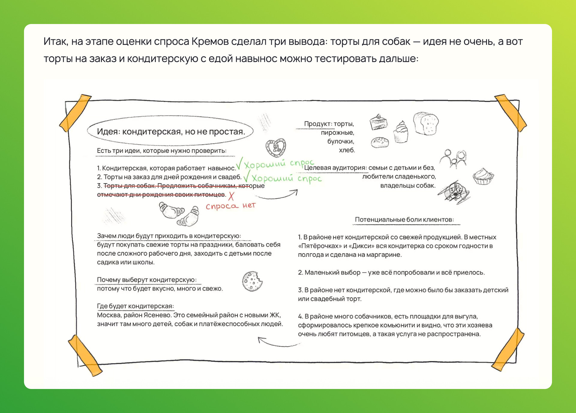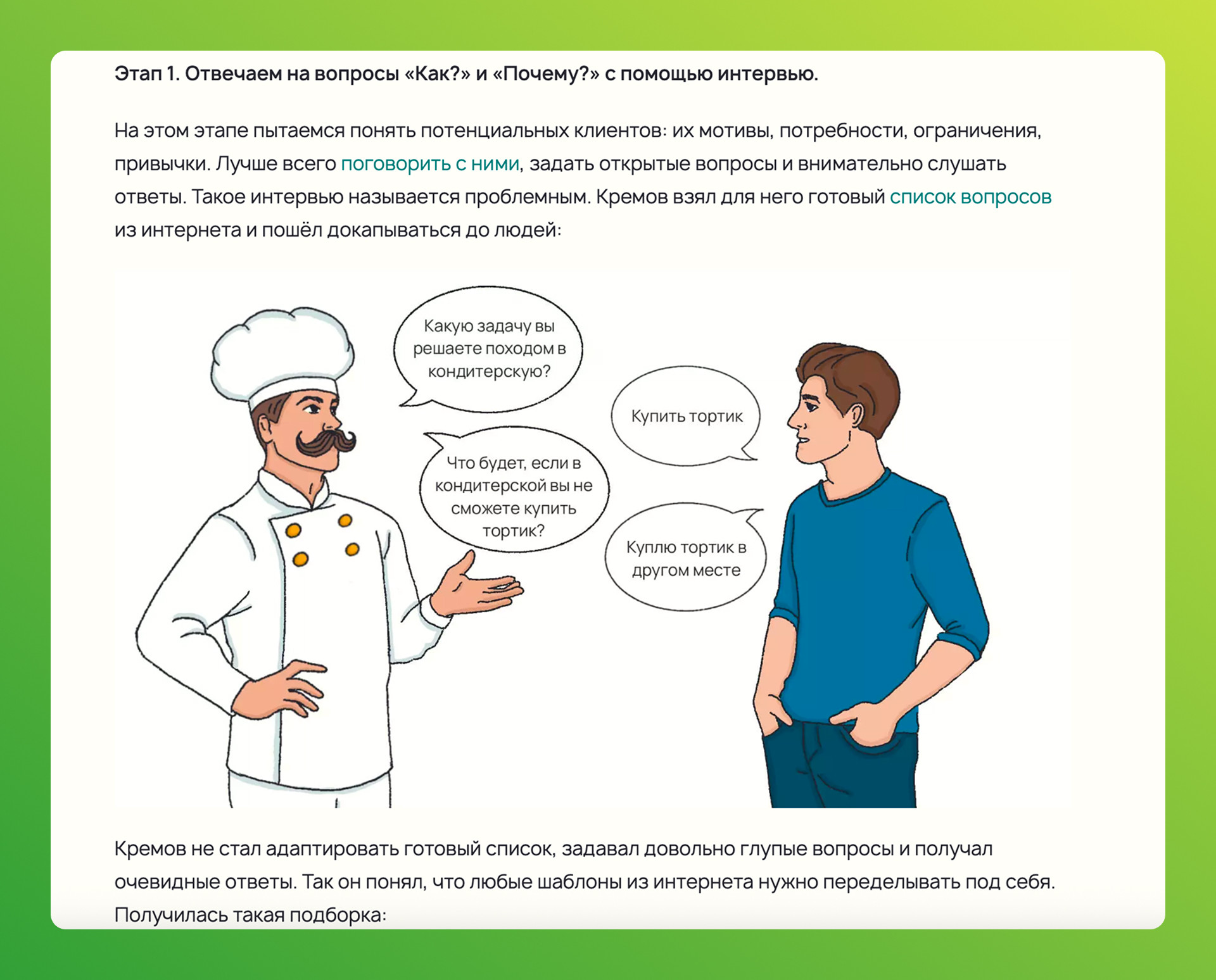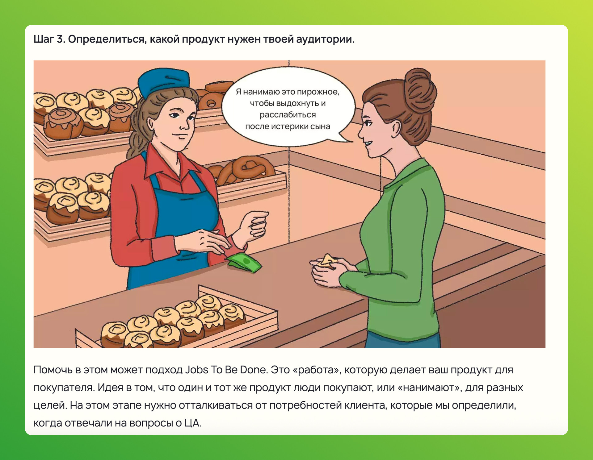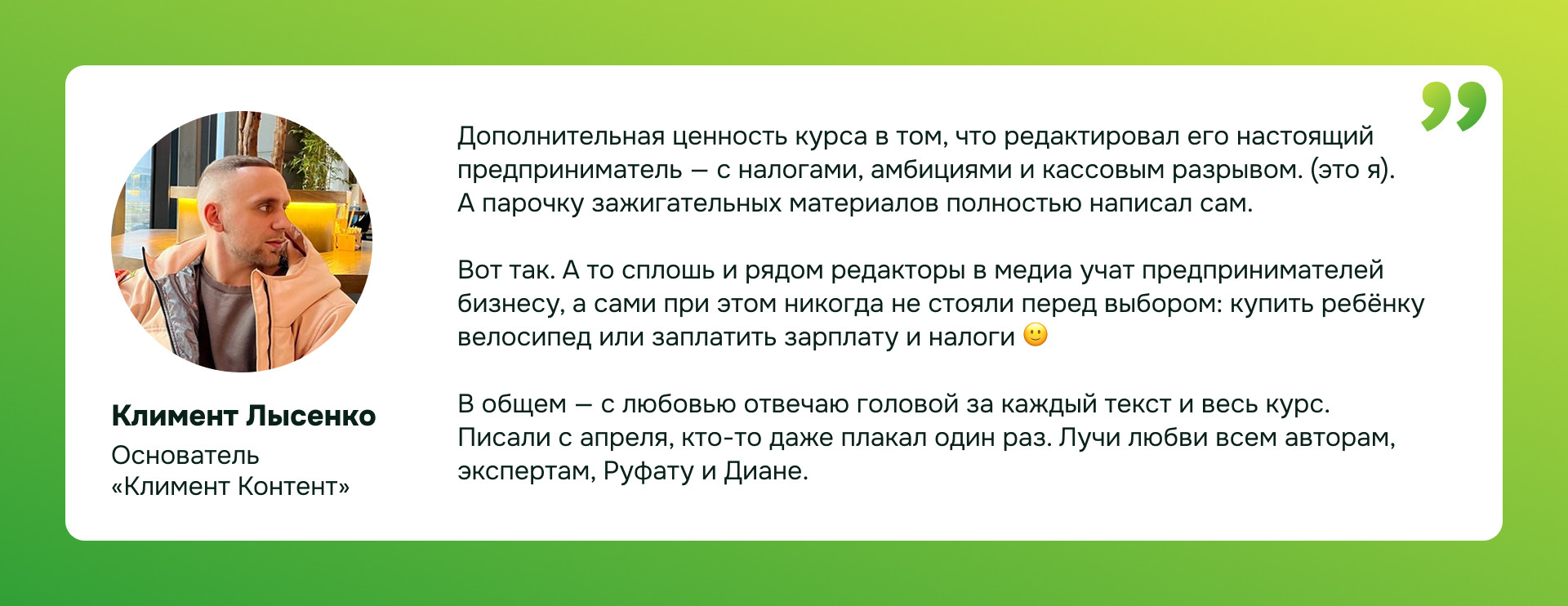 Вот темы статей по порядку: Команда. Над проектом работали 8 человек: 5 авторов, 2 редактора, иллюстратор, корректор и сеошник. Каждая статья проходила полный цикл: сбор фактуры с экспертом, написание, редактура, иллюстрации, корректура, SEO-оптимизация. Работа с экспертами. Часть экспертов давал клиент, часть находили сами. Среди них — руководитель направления инвестиций акселераторов Сбера, налоговый консультант с 17-летним опытом, директор по развитию финансовой компании, основатели исследовательских агентств. С каждым экспертом созванивались по видео, собирали фактуру, потом согласовывали готовый текст. Это важно: статьи не пересказывают первые ссылки из гугла, а на примере главного героя рассказывают реальный опыт людей, которые разбираются в теме. Сквозной герой. Мы придумали персонажа — Кремова, молодого кондитера, который мечтает открыть свою кондитерскую. Кремов — не просто иллюстрация к теории. Он ошибается, сомневается, учится на своих косяках. Когда читатель видит, как Кремов чуть не открыл кондитерскую в бизнес-центре, где люди хотят борщ, а не эклеры — это запоминается лучше любого списка «10 ошибок начинающего предпринимателя». Иллюстрации. Иллюстратор рисовал Кремова и визуализировал сложные концепции. Картинки не декоративные — они наглядно объясняют сложный материал или помогают раскрыть историю. Иллюстрация — мощная штука. Самое любимое, когда иллюстрация не только повышает понимаемость текста, но и развлекает читателя одновременно. Такое всегда врезается в память и лучше запоминается. Иногда иллюстрация помогает донести банальную мысль, которую текстом доносить либо избыточно, либо слишком наивно. А иллюстрацией — ёмко, комично и убедительно: А иногда просто развлекали читателя юмором с помощью картинок. Например, в статье «Как ставить цели в бизнесе, чтобы легко достигать выдающихся результатов»: Писали живым языком, бойко, без канцелярита, местами провокационно. «Боже, как же я затрахался, пора нанимать персонал, иначе вместо отпуска поеду в крематорий» — это реальная цитата из статьи про найм. На такие смелости изначально дал разрешение клиент, и мы его выдержали во всех 19 материалах. За 2 месяца написали 19 статей. Каждая — полноценный лонгрид с экспертной фактурой, примерами, иллюстрациями и SEO-оптимизацией. Статьи опубликованы на сайте «По ходу разберёмся», но закрыты от поисковиков. Доступ к ним только через телеграм-бота, где продаётся курс. Стоимость курса — 4 590 рублей. В первый день продаж курс купили 37 человек. Телеграм-бота разрабатывала другая команда — мы отвечали только за контент. Руфат Валиуллин, главный редактор «По ходу разберёмся»: «Делал большой спецпроект с Климентом и его ребятами — отличное агентство. Пишут классные, живые статьи, придумывают смешной, цепляющий визуал. Сроки не продалбывают, а если что-то идёт не так — предупреждают и предлагают вариант решения. Всегда идут навстречу и горят проектом. В общем, получил полноценный кайф от сотрудничества с Климентом». 100+ клиентов: S7, Spirit. Fitness, Яндекс. Практикум, Exponenta, Финтабло и другие