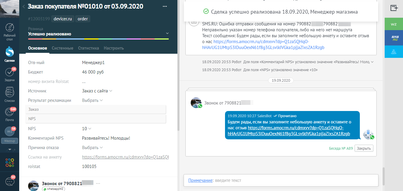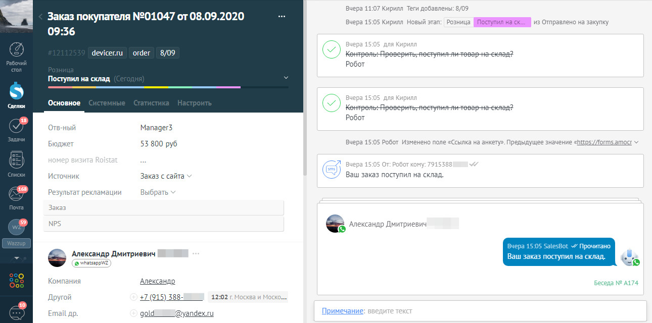 Заявки с сайта, а также форм обратной связи подгружаются в карточку сделки amoCRM автоматически. На практике происходит так: клиент заходит на сайт, выбирает товар, нажимает «заказать» — заявка оформлена. В этот момент у менеджера в amoCRM всплывает сообщение о появлении нового лида. Данные, которые клиент заполняет на сайте, сохраняется в полях карточки сделки. С покупателем сразу начинает вестись работа. Так, заявки с интернет-магазина моментально становятся доступны для обработки в amoCRM. Настроили телефонию SipuniНастало время выбирать IP-телефонию для стабильной работы с клиентами. Выбор пал на телефонию «Sipuni». После настройки компания получила такие преимущества, как: Чтобы собирать воедино все обращения клиентов и не терять заявки, интегрировали источники заявок с amoCRM: мессенджеры whatsapp, viber, telegram и социальные сети: instagram, facebook, вконтакте. Полученные сообщения автоматически попадают в amoCRM в папку «Неразобранное». Оттуда менеджер создает новые сделки и ведет переписку из карточки сделки. Не важно из какого источника написал клиент — история взаимодействий с клиентами сохраняется в карточке сделки. Следующий шаг — настройка Salesbot в воронке продаж для отправки уведомлений покупателям. Salesbot — это внутренний бот amoCRM. Робот инициирует общение с клиентом через любой мессенджер без участия менеджера. Когда заказ клиента поступает на склад, этап воронки автоматически меняется на «Заказ на складе». На этом этапе покупатель получает уведомление, как это показано на скриншоте. Менеджер может использовать стандартные шаблоны писем для клиентом, либо отредактировать текст письма-уведомления для покупателей. Также salesbot выполняет сбор обратной связи, чтобы компания Devicer могла иметь полное представление о покупателях. Спустя пару дней после покупки робот отправляет письмо с просьбой перейти по ссылке и оценить впечатления от покупки.