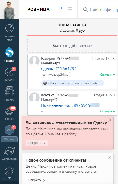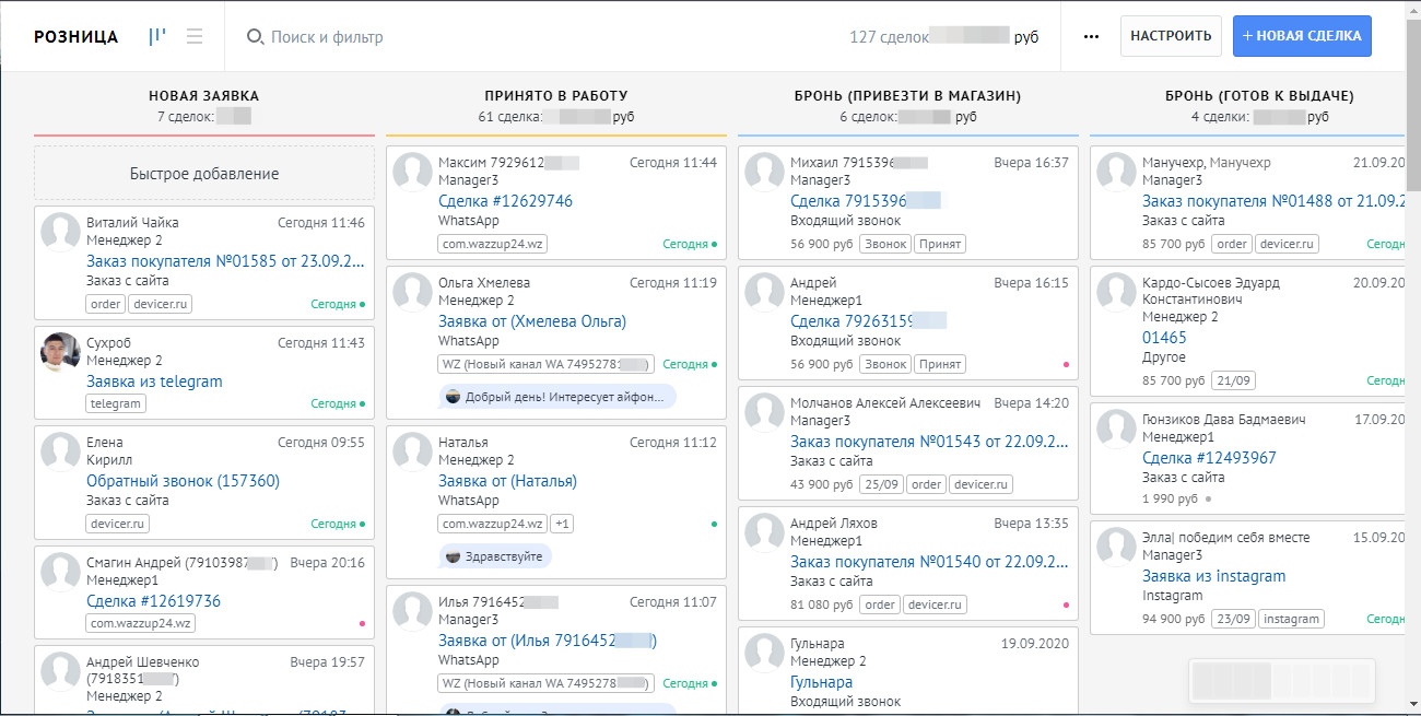 Сюда попадают заявки с сайта, социальных сетей. Менеджер сразу связывается с клиентом, подтверждает заказ, выставляет счет и продвигает покупку по воронке продаж.