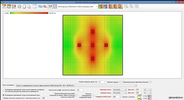 проектирования. Рис.3 Интерфейс программы Рис.4 Расчет плиты на упругом основании Модуль позволяет провести расчет осадки фундаментов и
