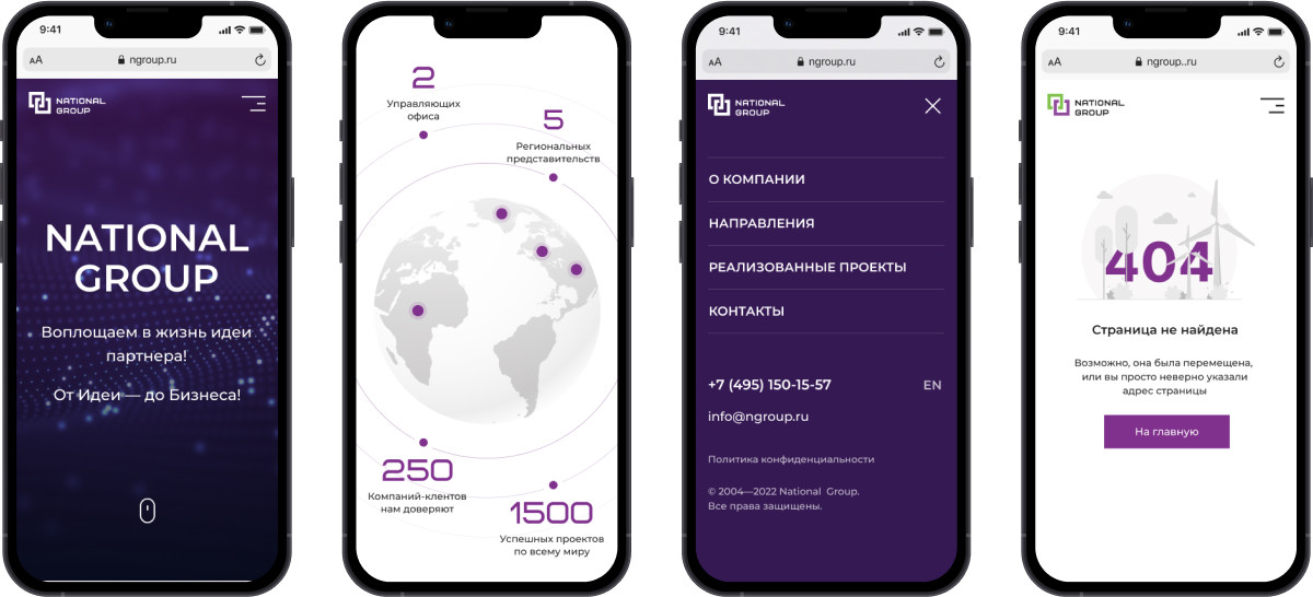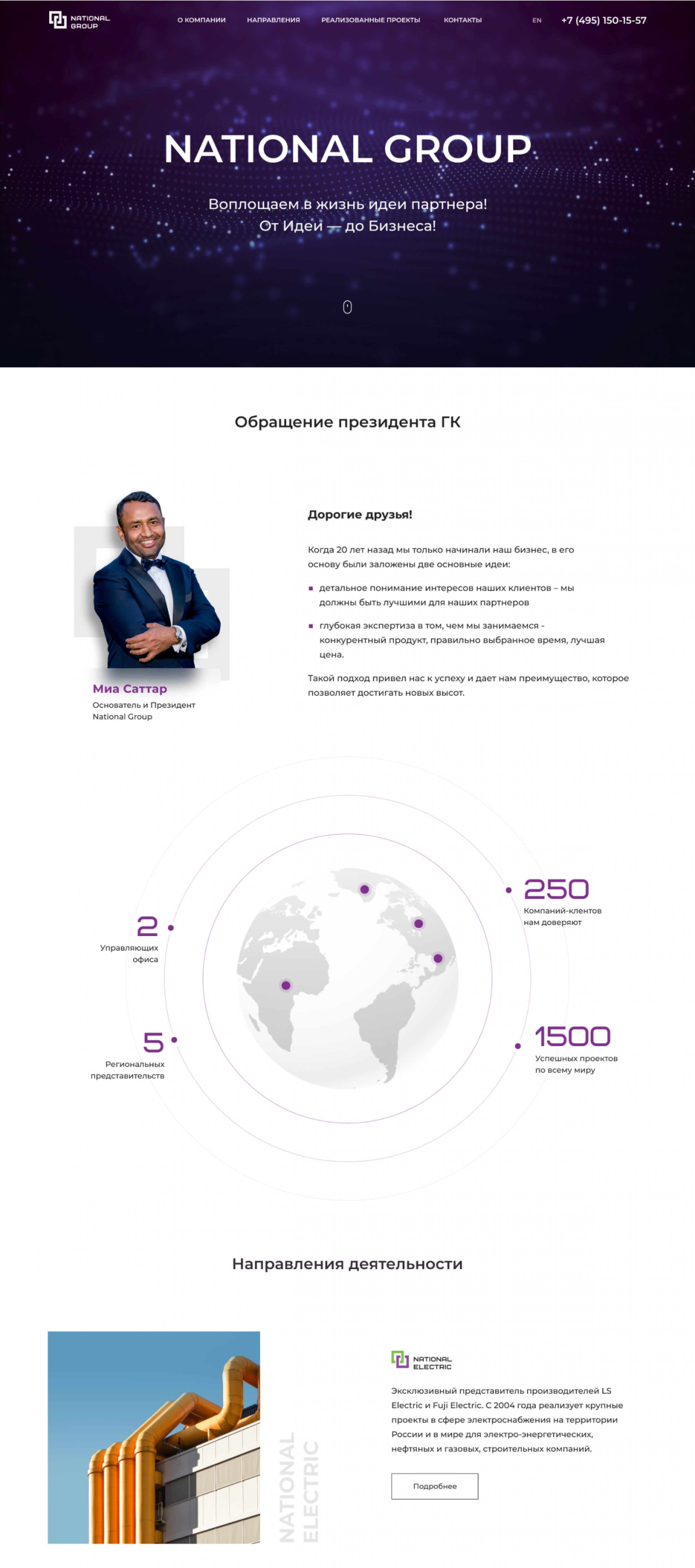Использование единого логотипа для всех 5 направлений деятельности компании помогло стилистически связать различные направления бизнеса. Подкрепляет слова основателя компании, а также подчёркивает масштабность корпорации и глобальность бренда интегрированный глобус с обозначенными точками — крупнейшими реализованными проектами. разработан с использованием технологий WebGL. Основные показатели успешности компании выведены на орбитах В качестве технологической платформы для разработки проекта был выбран сервис Tilda Publishing. Это функциональный удобный конструктор сайтов, обладающий всеми необходимыми опциями и позволяющий быстро создавать красивые и функциональные сайты. Сервис разработан в России, благодаря чему с сервисом не возникает проблем из-за санкций. Контакты из формы обратной связи собираются в CRM Tilda. Все заявки дублируются на электронную почту. Сайт разработан на 2 языках: русский и английский. Версии сайта полностью идентичны и реализованы в рамках одного домена. Особое внимание при разработке сайта уделялось удобству мобильной версии. Благодаря детальной проработке ее дизайна пользоваться сайтом со смартфонов, планшетов и ноутбуков стало гораздо комфортнее. Мы разработали эффективный презентационный инструмент для компании National Group, позволяющий продемонстрировать все возможности и направления деятельности группы компаний. Дизайн сайта полностью соответствует ожиданиям Заказчика, в обозначенные сроки и бюджет мы уложились. Есть проект для нас? Давайте обсудим!)