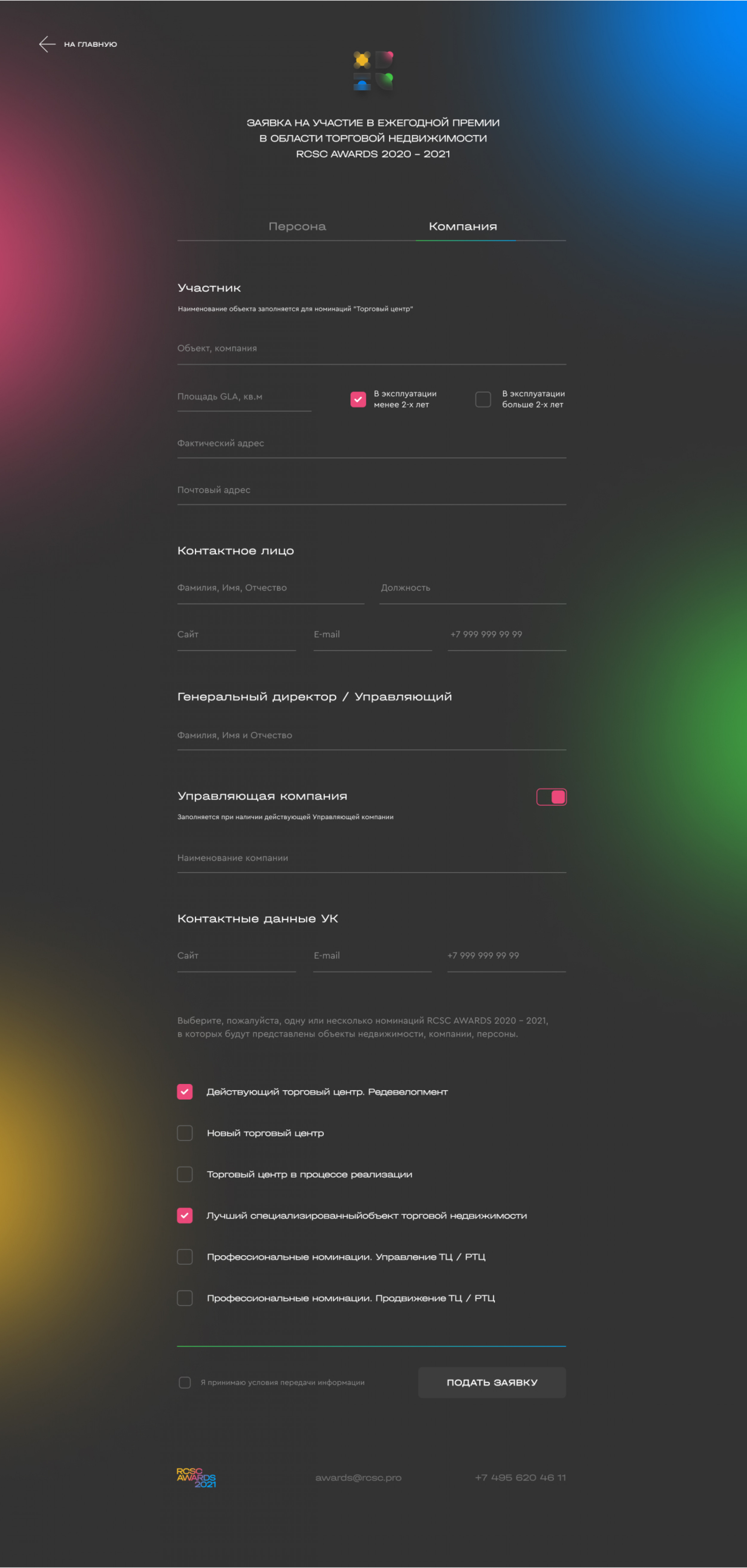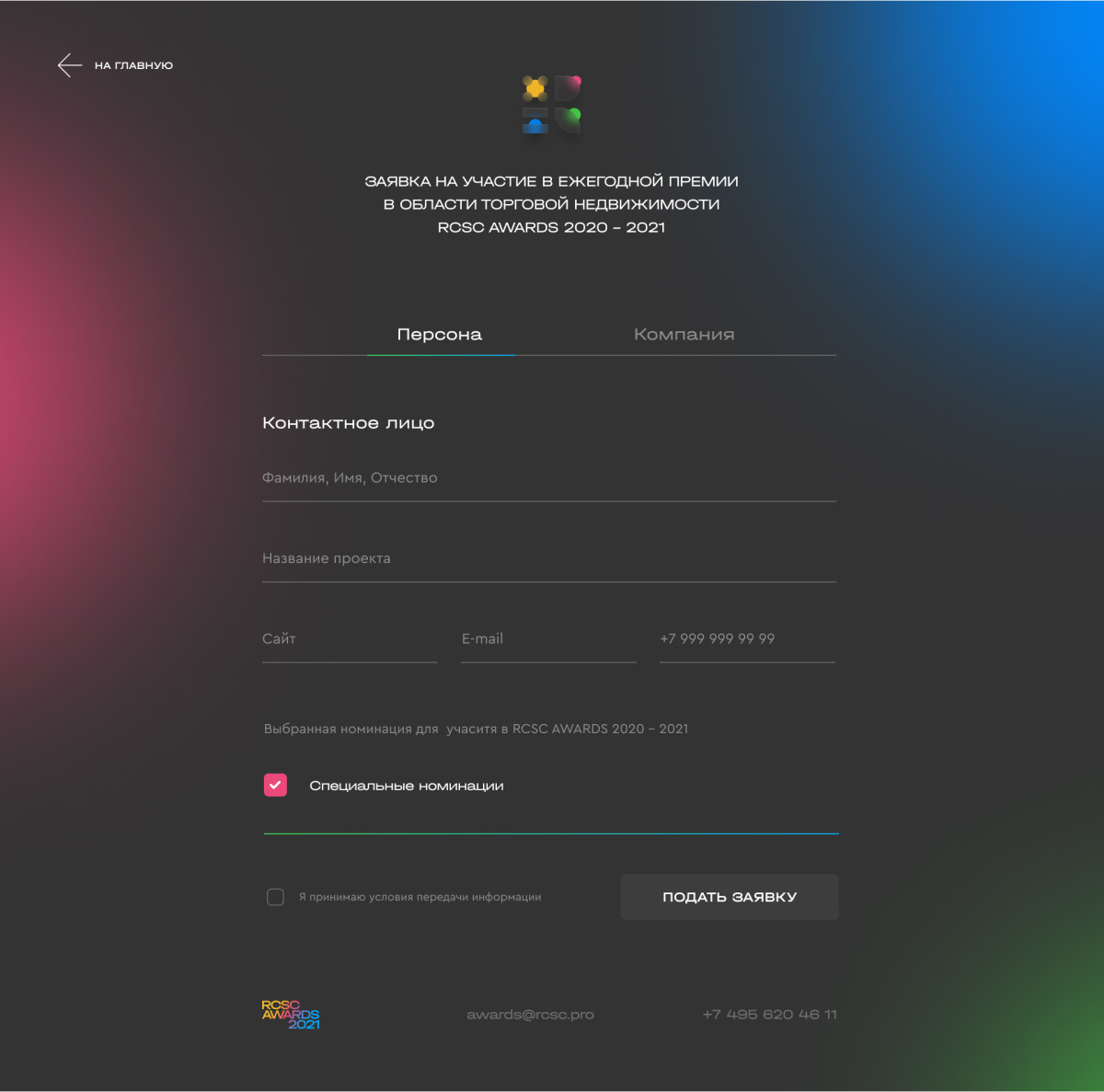 Форма заявки на участие в ежегодной премии доступна для частных лиц и компаний. В зависимости от типа пользователя в форме разное количество полей.