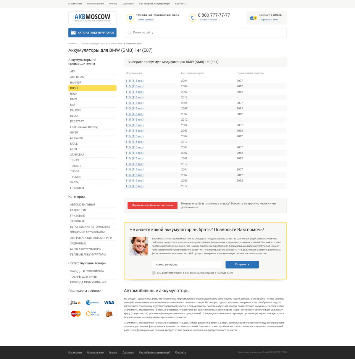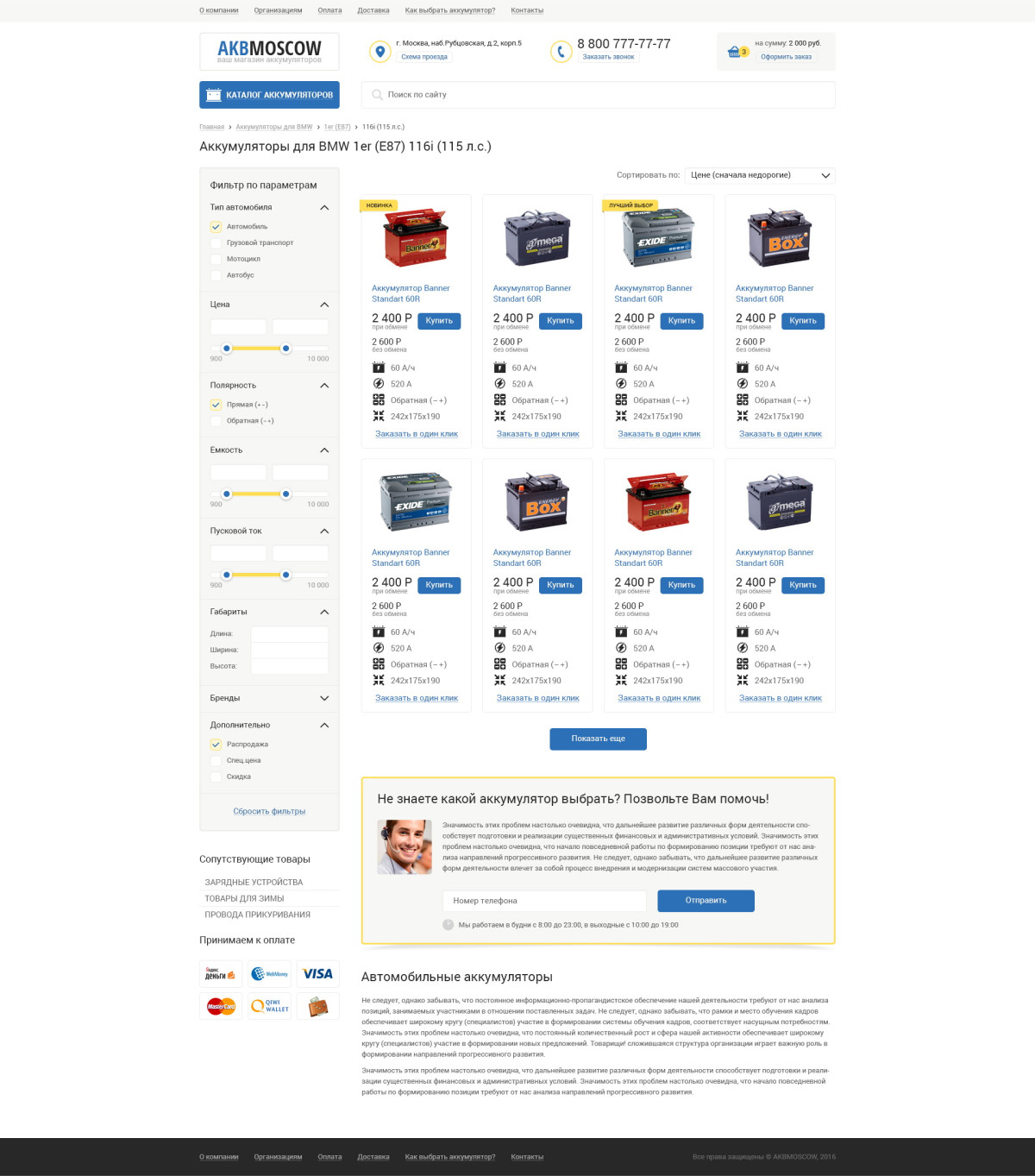 Разработать интернет-магазин АКБ с фильтром подбора аккумулятора