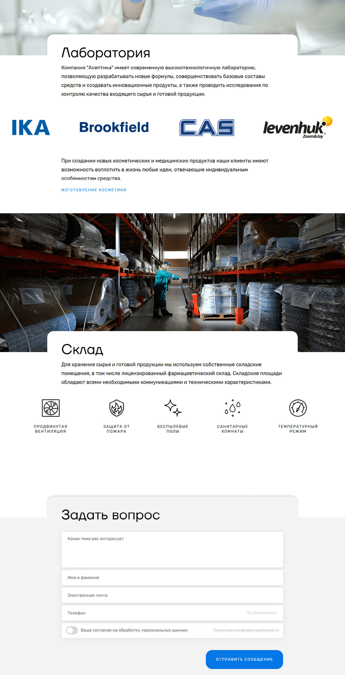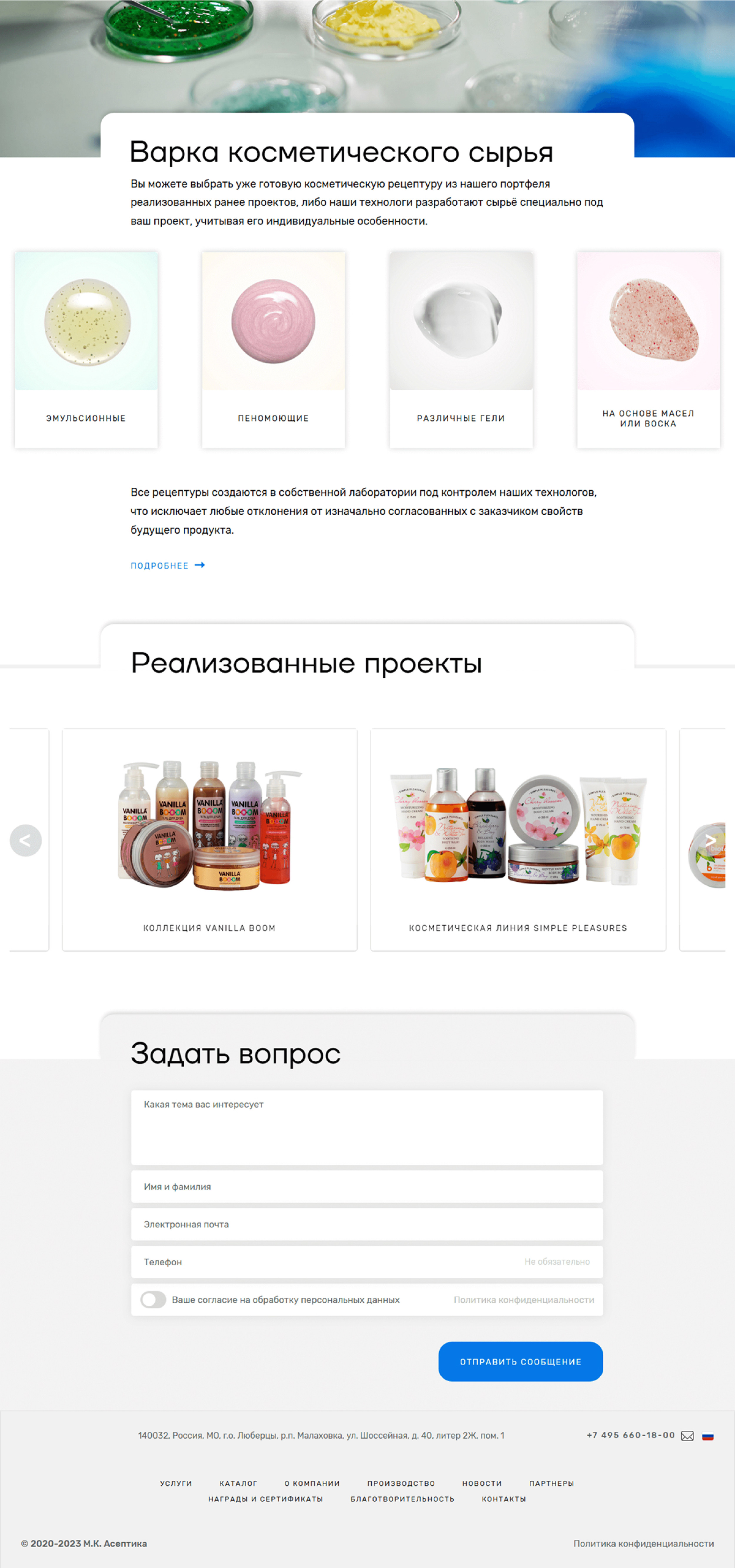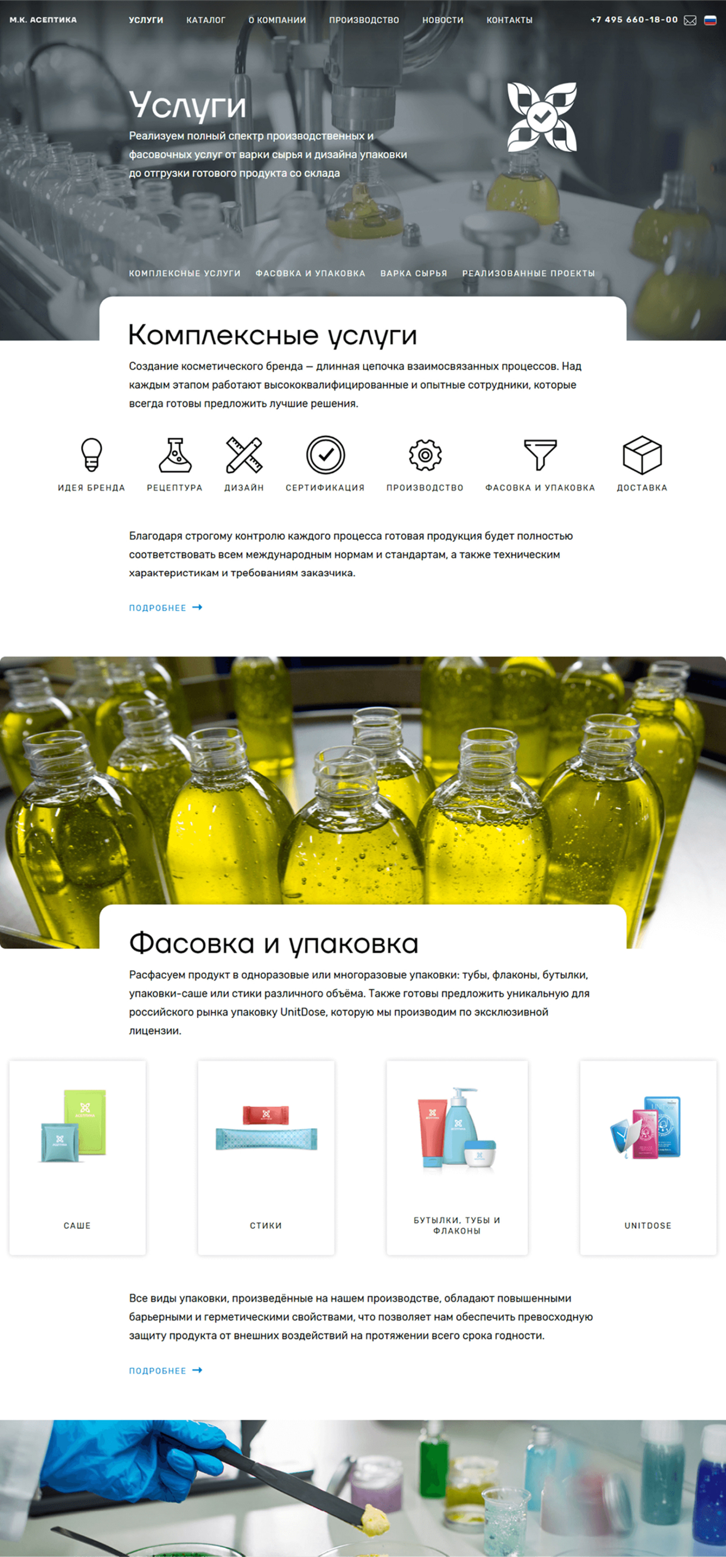 Компания предлагает полный спектр услуг: от разработки формул до упаковки готовой продукции.