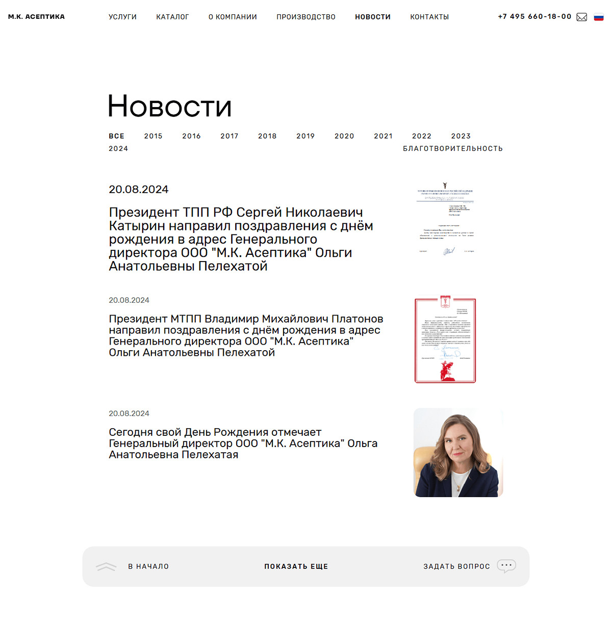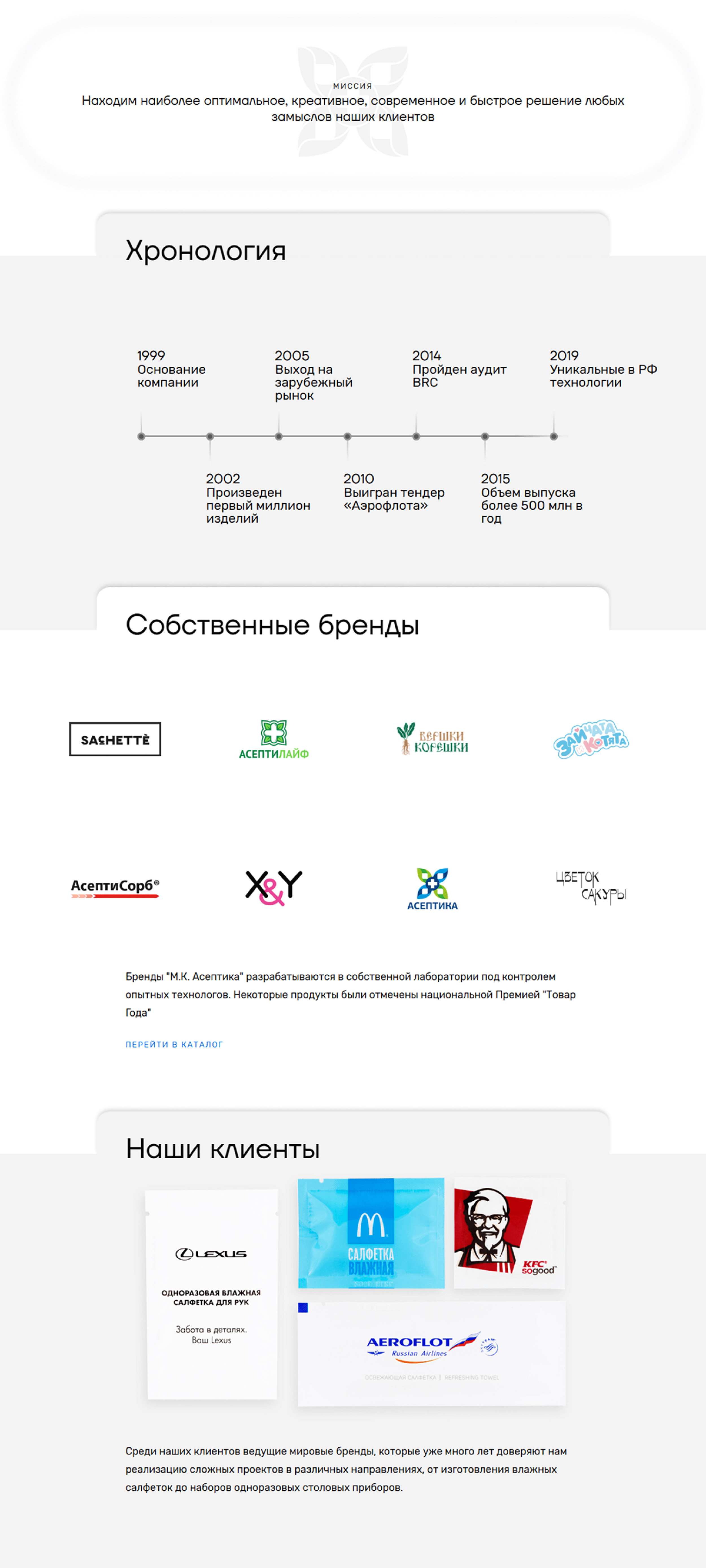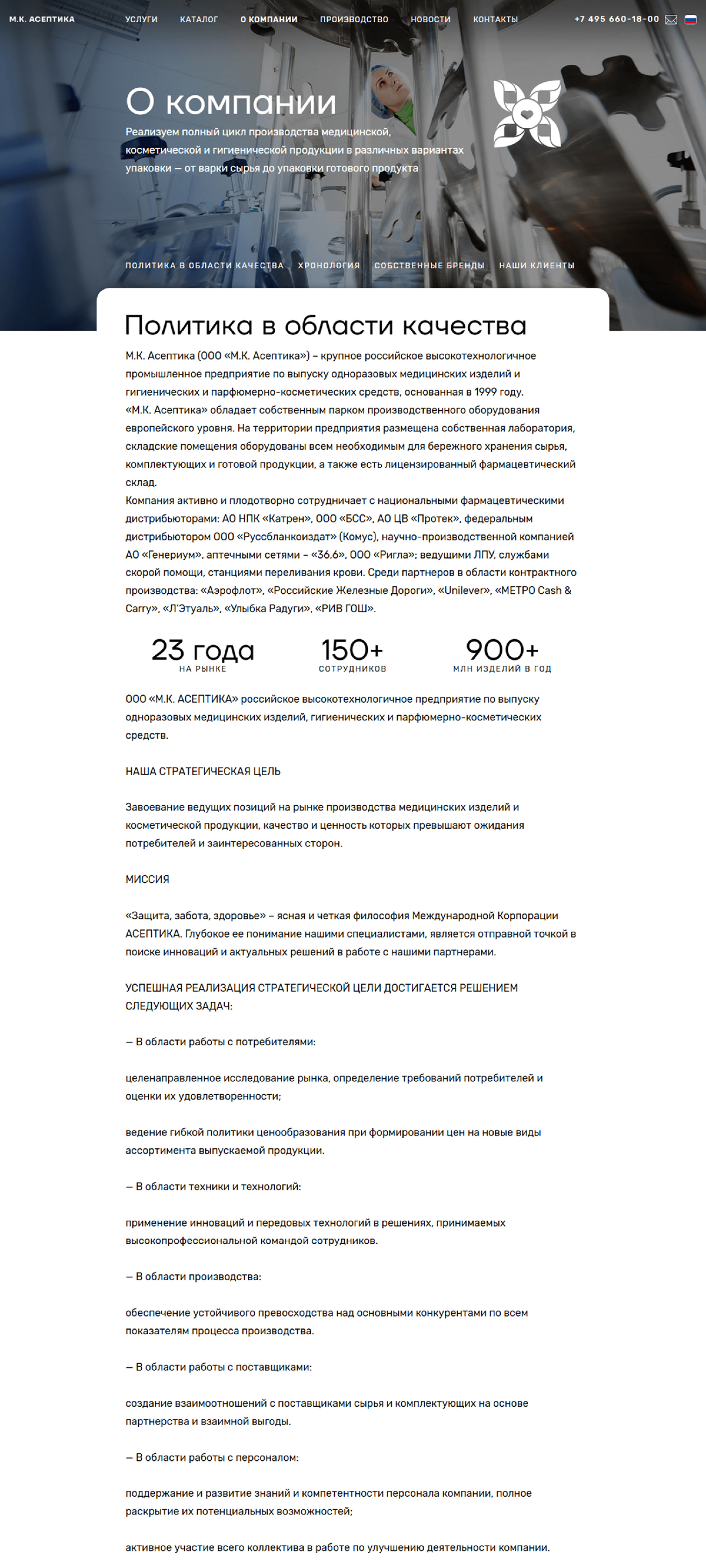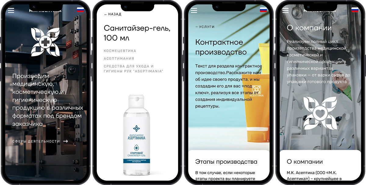 Всё это способствует укреплению лидерских позиций и поддержанию высокого уровня надежности продукции на рынке. На сайте представлен широкий ассортимент продукции компании, включающий средства для дезинфекции, косметические и гигиенические товары. Удобная навигация позволяет легко ознакомиться с категориями и выбрать нужные продукты как по категориям, так и по брендам. В карточках товаров приведены ключевые характеристики, подчеркивающие качество и безопасность продукции, а также акцент на соответствие строгим стандартам. В данном разделе описана миссия и ценности компании, её многолетний опыт и амбиции в области контрактного производства медицинских и косметических средств. Подчеркиваются достижения и лидерские позиции М.К. Асептика на рынке, ориентация на высокие стандарты качества и ответственность перед клиентами. Компания активно поддерживает инновации и придерживается высоких стандартов на каждом этапе производства, что укрепляет её статус надежного партнера. Здесь представлена информация о высокотехнологичных процессах, используемых компанией для создания медицинских и косметических средств. Описаны современные производственные мощности и оборудование, а также внимание к качеству и безопасности продукции. Компания акцентирует внимание на строгом контроле на всех этапах, что позволяет поддерживать ее лидерство на рынке и внедрять инновационные решения. А качественные фотографии производственного комплекса, оборудования и лаборатории помогут пользователю глубже погрузиться в процесс производства. В разделе публикуются актуальные события и достижения компании, включая запуск новых продуктов, участие в выставках и другие важные мероприятия. Новости помогают поддерживать связь с клиентами и партнерами, информируя их о значимых обновлениях в деятельности компании. На сайте реализованы 3 языковые версии: Это позволяет расширить аудиторию и облегчить доступ к информации о компании и ее продуктах для международных клиентов. Многоязычность подчеркивает амбициозный подход компании к развитию и укреплению позиций на глобальном рынке. На сайте проработана адаптивная версию, что обеспечивает комфортное восприятие контента на экранах любых устройств — от настольных компьютеров до смартфонов. Это делает информацию о компании и её продуктах доступной и удобной для пользователей, независимо от их предпочтений в использовании технологий. Адаптивный дизайн подчеркивает стремление компании к обеспечению высокого уровня пользовательского опыта. Еще больше проектов и полезных материалов на нашем сайте: