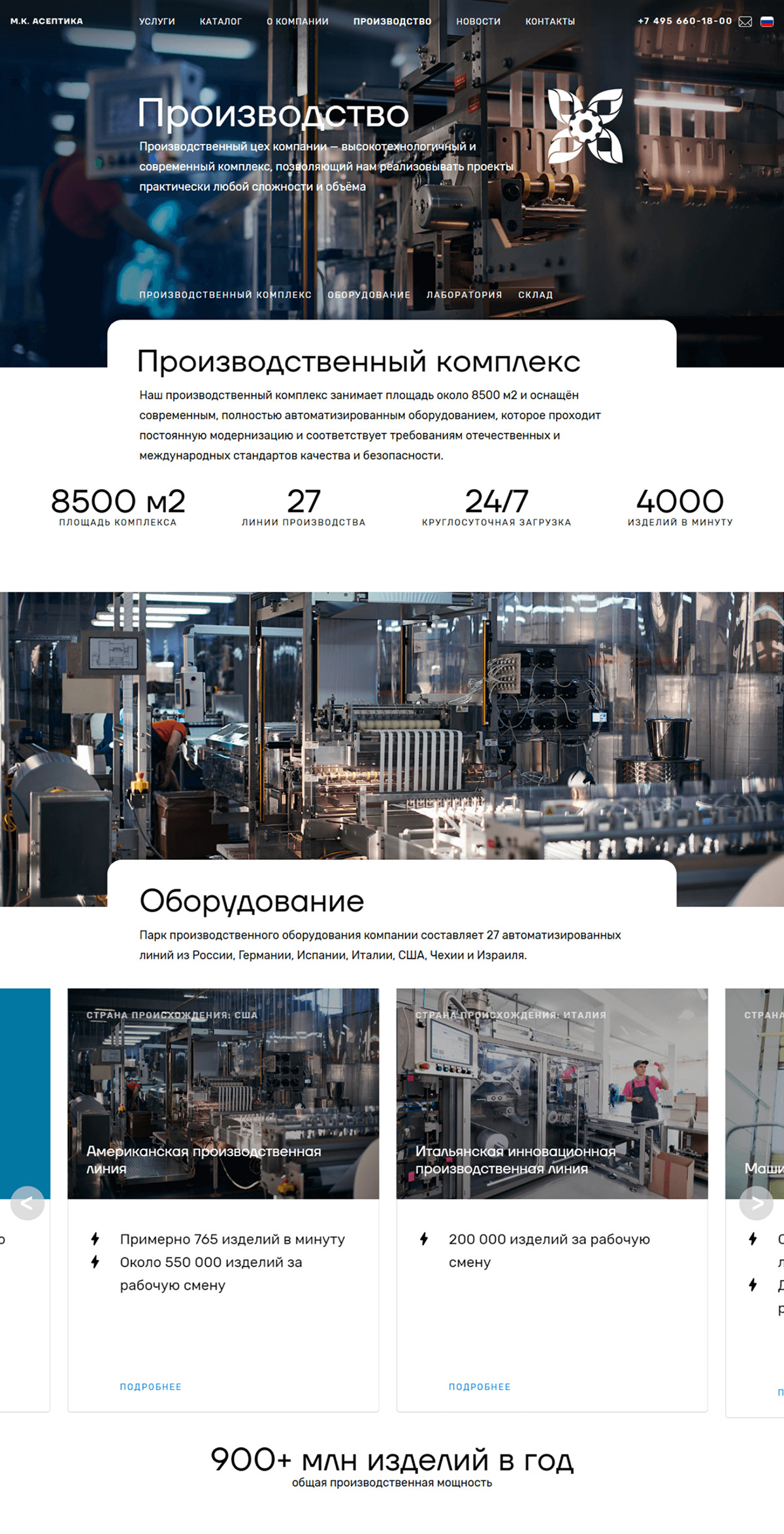Качественные фотографии товаров и производственных процессов выделяются на фоне минималистичного оформления, что облегчает поиск необходимой информации пользователям.