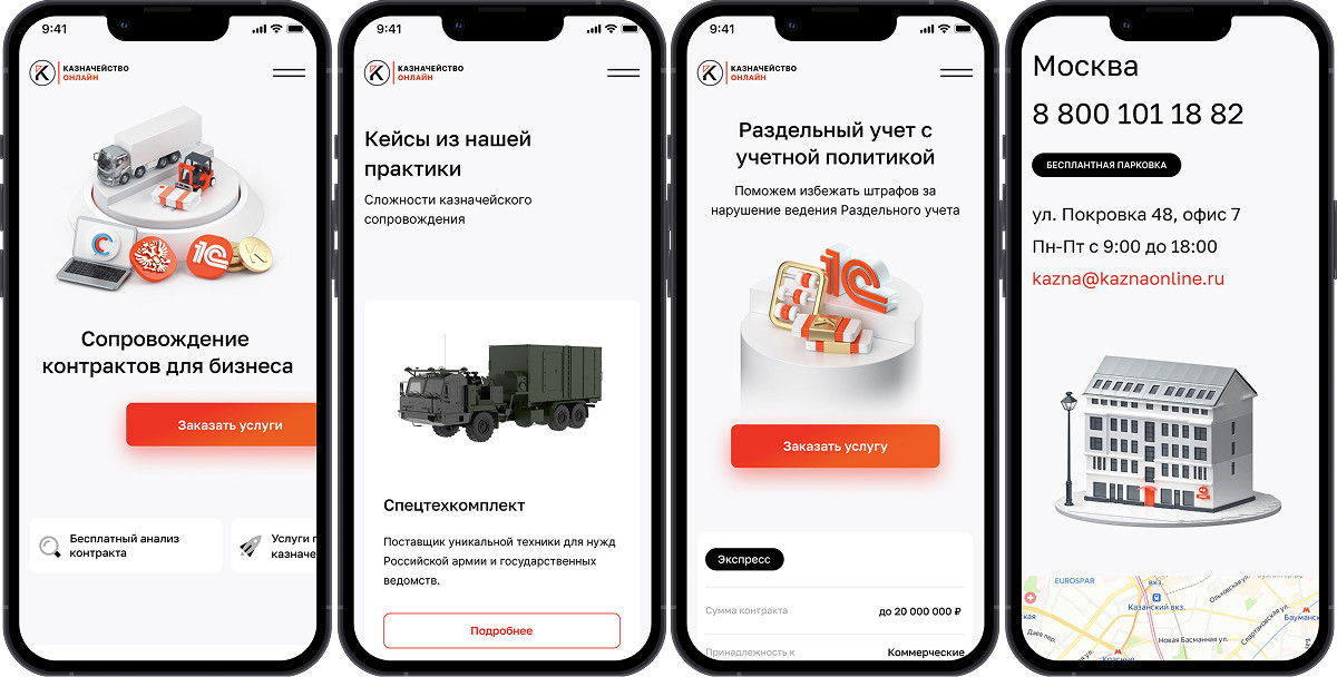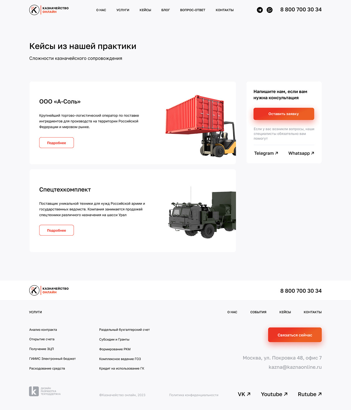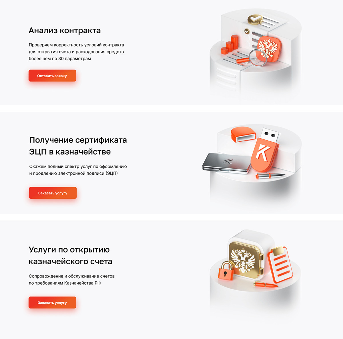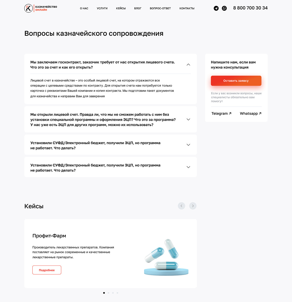 Разработаны уникальные 3D изображения для каждого значимого раздела сайта. Они придают ему современный и динамичный вид, делая информацию более наглядной и вовлекающей. На главной странице сайта представлена информация об услугах компании, ориентированных на казначейское сопровождение. Сайт привлекает внимание современными анимированными 3D-изображениями и демонстрирует ключевые преимущества компании. Включены основные показатели в цифрах, полный комплекс услуг, а также удобный калькулятор для расчета стоимости. Пошаговое описание пути клиента помогает ориентироваться в процессе сотрудничества, а карта России с отметками о присутствии компании и список партнеров усиливают доверие и подчеркивают ее широкую географию и репутацию. Каждая страница раздела включает подробное описание комплексного сопровождения клиентов на всех этапах казначейских операций, подчеркивая опыт и надежность компании. Информация представлена с акцентом на преимущества сотрудничества и основные показатели в цифрах. Также на страницах услуг расположен удобный калькулятор для расчета стоимости и форму для быстрого заказа услуги, что позволяет пользователям легко получить информацию и оставить заявку на сотрудничество. Для каждой услуги были разработаны уникальные 3D-изображения, которые помогают визуально поддерживать информацию и удерживать внимание посетителей. Данный раздел демонстрирует успешные примеры проектов компании в казначейском сопровождении контрактов. Здесь представлены разнообразные решения для клиентов из различных отраслей, акцентируя внимание на достигнутых результатах, решении сложных задач и применении уникальных подходов. Каждое описание кейса подчеркивает опыт и профессионализм компании, предоставляя потенциальным клиентам наглядное представление о возможностях и эффективности сотрудничества. Для каждого кейса разработаны уникальные 3D-изображения, которые визуально подчеркивают представление информации и результаты работы. Раздел предлагает актуальные статьи и материалы, посвященные казначейскому сопровождению и финансовому консалтингу. Здесь публикуются полезные советы, аналитика, новости отрасли и обсуждения актуальных тем, что помогает клиентам лучше ориентироваться в изменениях и тенденциях. Блог подчеркивает экспертность компании и её стремление делиться знаниями с аудиторией. Раздел предоставляет пользователям исчерпывающую информацию по наиболее часто задаваемым вопросам, связанным с казначейским сопровождением и услугами компании. Данный раздел позволяет быстро находить ответы на актуальные запросы клиентов, что упрощает процесс получения информации и повышает уровень обслуживания. Удобная структура вопросов и ответов способствует лучшему пониманию услуг и процессов, предлагаемых компанией. Раздел предоставляет пользователям важную информацию для связи с компанией. Здесь можно найти адреса офисов в Москве и Санкт-Петербурге, контактные телефоны и электронную почту для связи. Удобная форма обратной связи позволяет клиентам легко оставлять запросы и получать консультации. Предусмотрены различные формы для удобства пользователей, включая возможность задать вопрос и заказать услугу. Эти формы облегчают взаимодействие с клиентами, позволяя быстро получить необходим