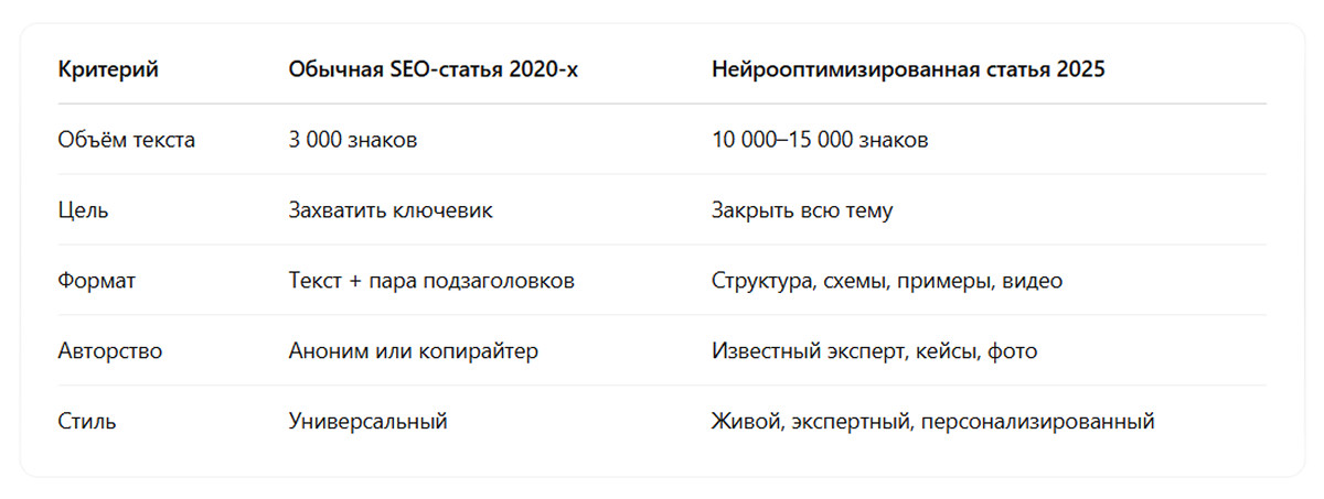 Это значит: если на сайте нет экспертного и подробного контента, ваш сайт не попадёт в «нейроподборку». Нейросеть ищет не просто ключевые слова, а суть и авторитетность.