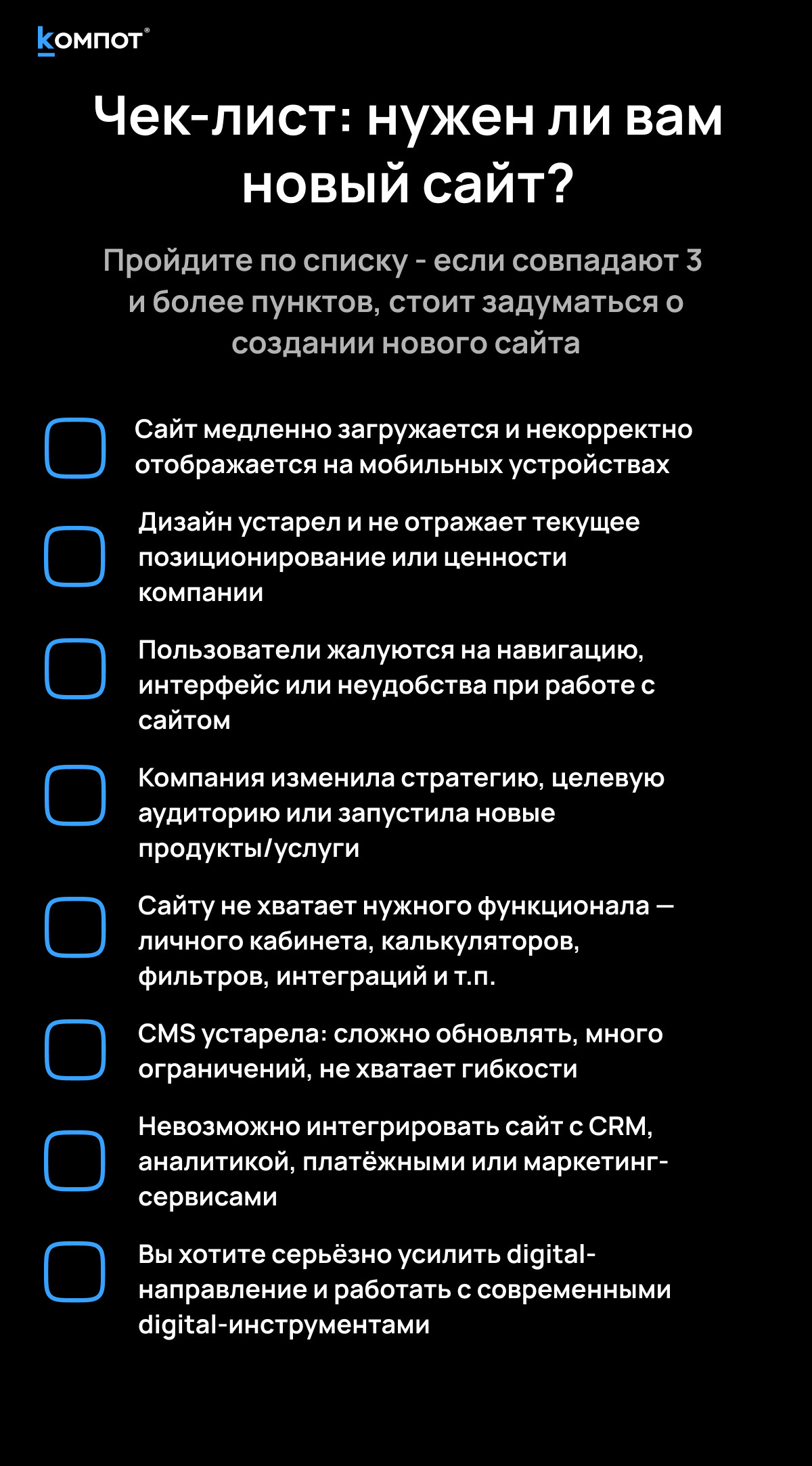 Пройдите по списку и посчитайте, сколько утверждений совпадает с вашей ситуацией. Если у вас 3 и более совпадений — скорее всего, ваш бизнесу нужен новый сайт. Специалисты веб-интегратора «Компот» всегда помогут вам принять правильное решение. Если вы не уверены, с чего начать — мы проведём аудит, поможем разобраться: дорабатывать, переносить или создавать новый сайт с нуля. Разработаем индивидуальный план, учитывая особенности вашего бизнеса. Обратитесь к нам, и мы поможем вам превратить сайт в инструмент роста и продавать больше в веб-пространстве. Начнём трансформацию уже сегодня!