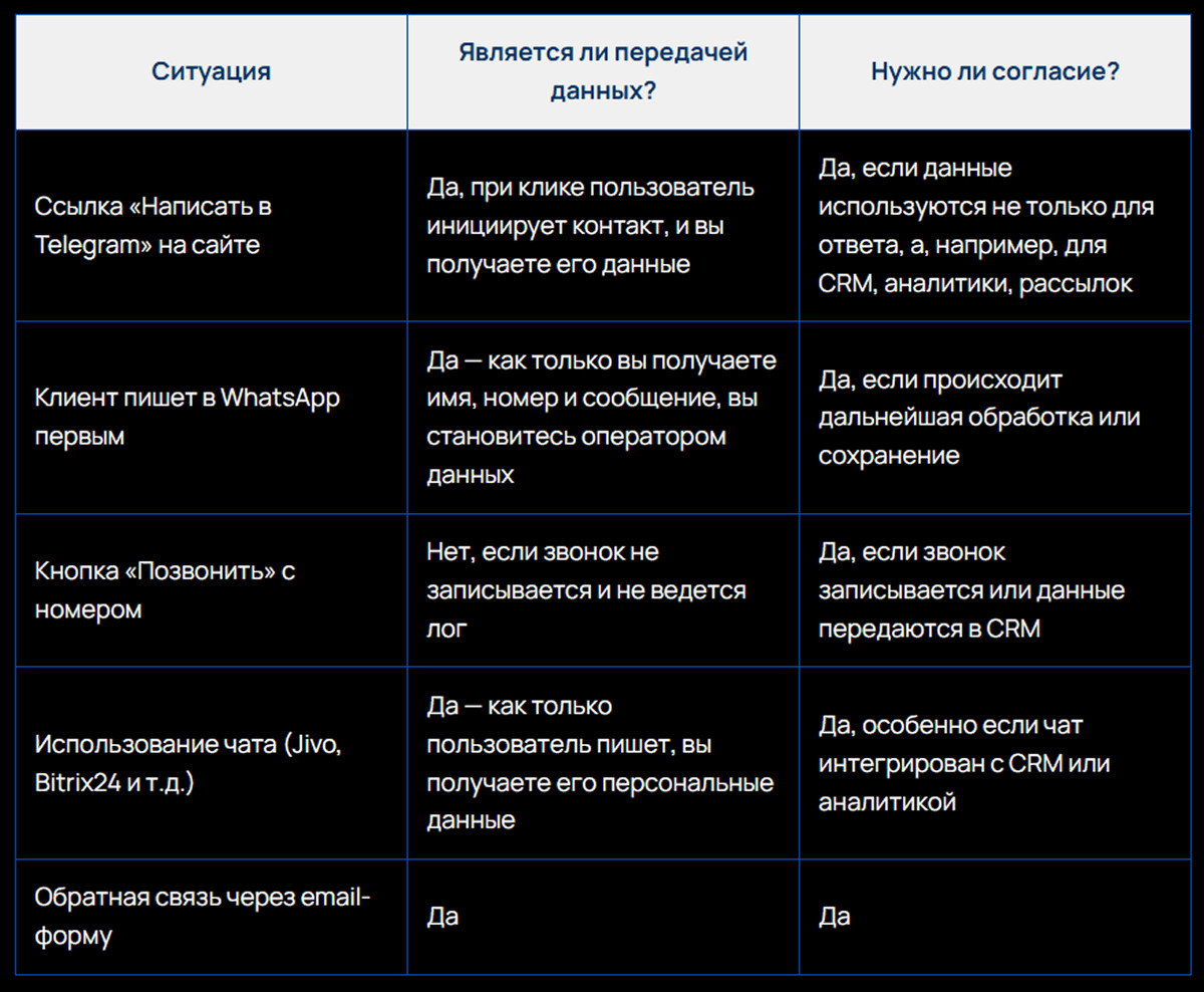 - Например, при обращении в Telegram можно отправить автоматическое сообщение: «Продолжая общение, вы соглашаетесь с нашей политикой обработки персональных данных. Подробнее — по ссылке.»