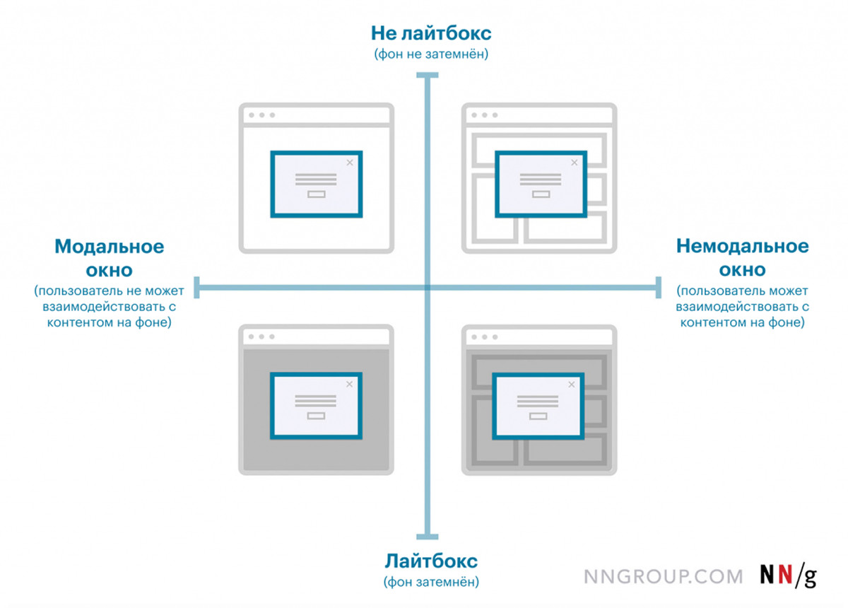 Диаграмма визуализирует различные виды всплывающих окон (модальные, немодальные, с затемнением и без
