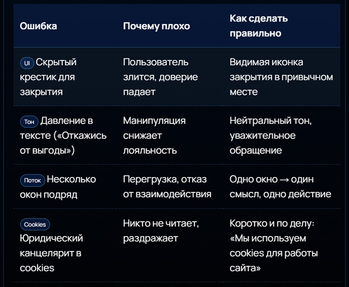 Всплывающие окна могут быть как сильным союзником, так и врагом бизнеса. Окно перестаёт быть раздражителем, когда оно появляется вовремя, несёт ценность и даёт выбор без давления. В этом случае пользователь воспринимает его как помощь, а бизнес получает рост подписок, заявок и продаж. Успехов в делах! ➡️ Подробнее о наших услугах можно узнать здесь.