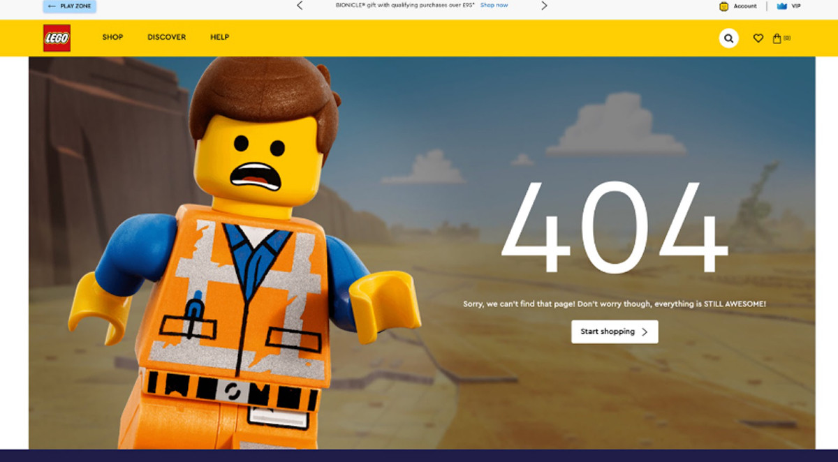 В то же время 404 сама по себе не «портит» SEO, но большое количество битых ссылок — да (Источник: JEMSU.com) Короткий понятный заголовок. «Страница не найдена» или брендовый слоган с цифрой 404. Короткое объяснение и эмпатия. «Похоже, страница переехала» вместо сухого «404». Главный CTA. Кнопка «На главную», «Вернуться в каталог», «Поиск по сайту». CTA должен быть виден первым. Поиск по сайту. Если у вас контент/каталог — обязательно поле поиска прямо на странице. Показ популярных разделов / хлебные крошки / карточки товаров. Помогает пользователю быстро сориентироваться и продолжить путь по сайту, не покидая его. Это особенно ценно, когда человек попал на ошибку в поиске конкретного товара или статьи — вы сразу даёте ему альтернативу и удерживаете внимание. Лёгкая навигация / ссылки на помощь. FAQ, контакты, чат-бот. Логирование и алерты для команды. 404 полезно не только пользователю: собирайте данные о популярных битых ссылках (реферы), чтобы поправить навсегда. Оптимизация производительности. Не грузите 404 тяжёлыми анимациями (особенно на мобильных), иначе вы ухудшите ситуацию. Пример: У Lego даже страница 404 работает на бренд: здесь соединились узнаваемый стиль, лёгкий юмор и коммерческая польза. Встревоженный Эммет из «Лего Фильма» усиливает эмоциональный эффект, а CTA «Начать покупки» мягко направляет пользователя обратно к покупкам. Ошибка 404 — это не тупик, а возможность. Для пользователя — улыбка, подсказка или быстрый путь к нужному контенту. Для бизнеса — шанс удержать внимание, сохранить доверие и даже стимулировать конверсию. Хорошо продуманная 404 работает на бренд не хуже главной страницы: она снижает отказы, улучшает UX и показывает, что вы заботитесь о своих клиентах даже в мелочах. Мы можем помочь: проведём UX/UI-аудит, предложим решения для доработки страниц, а также подскажем, как превратить ошибки и слабые места сайта в инструменты роста.