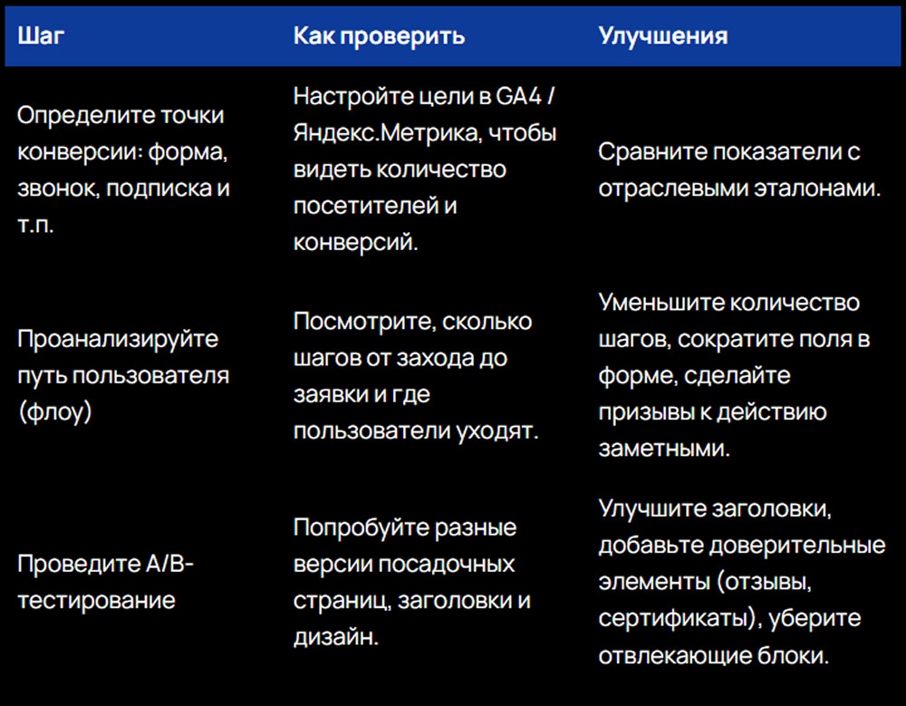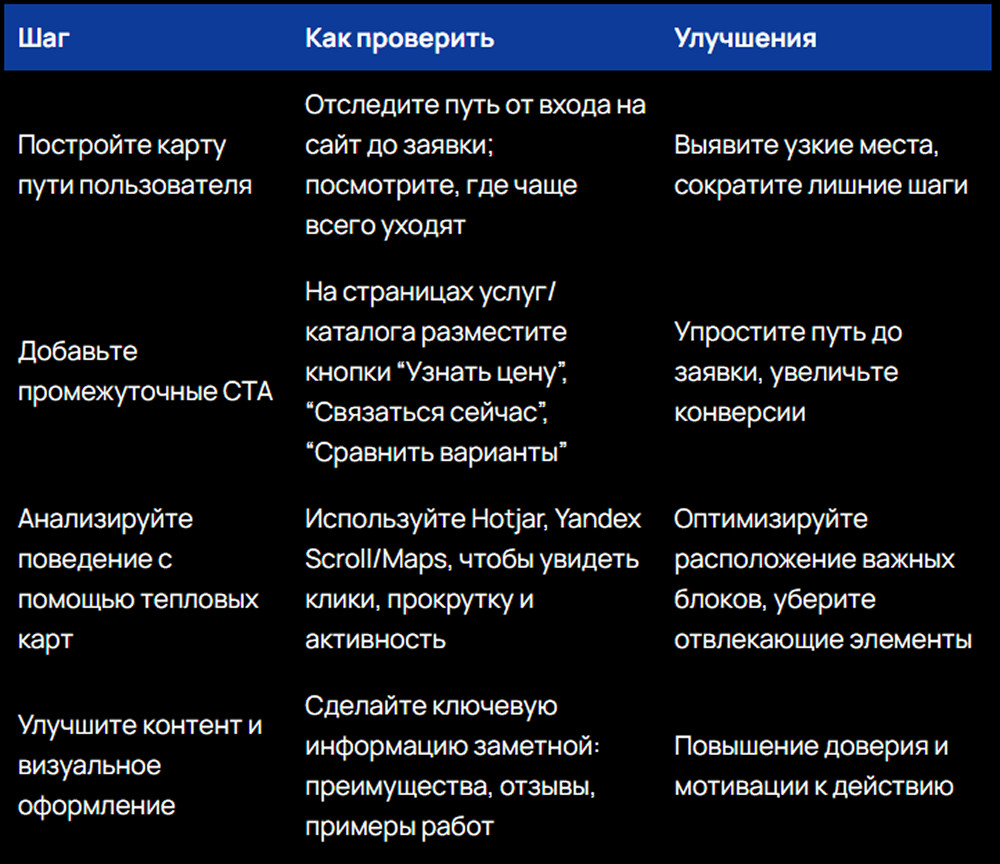 - Посадочные страницы, услуги или продукты плохо структурированы: слишком много «воды», мало призывов к действию, контент не убеждает.
