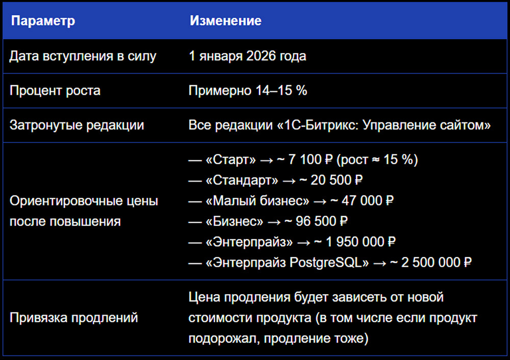 С 1 января 2026 года компания 1С-Битрикс впервые за три года планирует повысить цены на продукт «1С-Битрикс: Управление сайтом» на примерно 14-15 %.