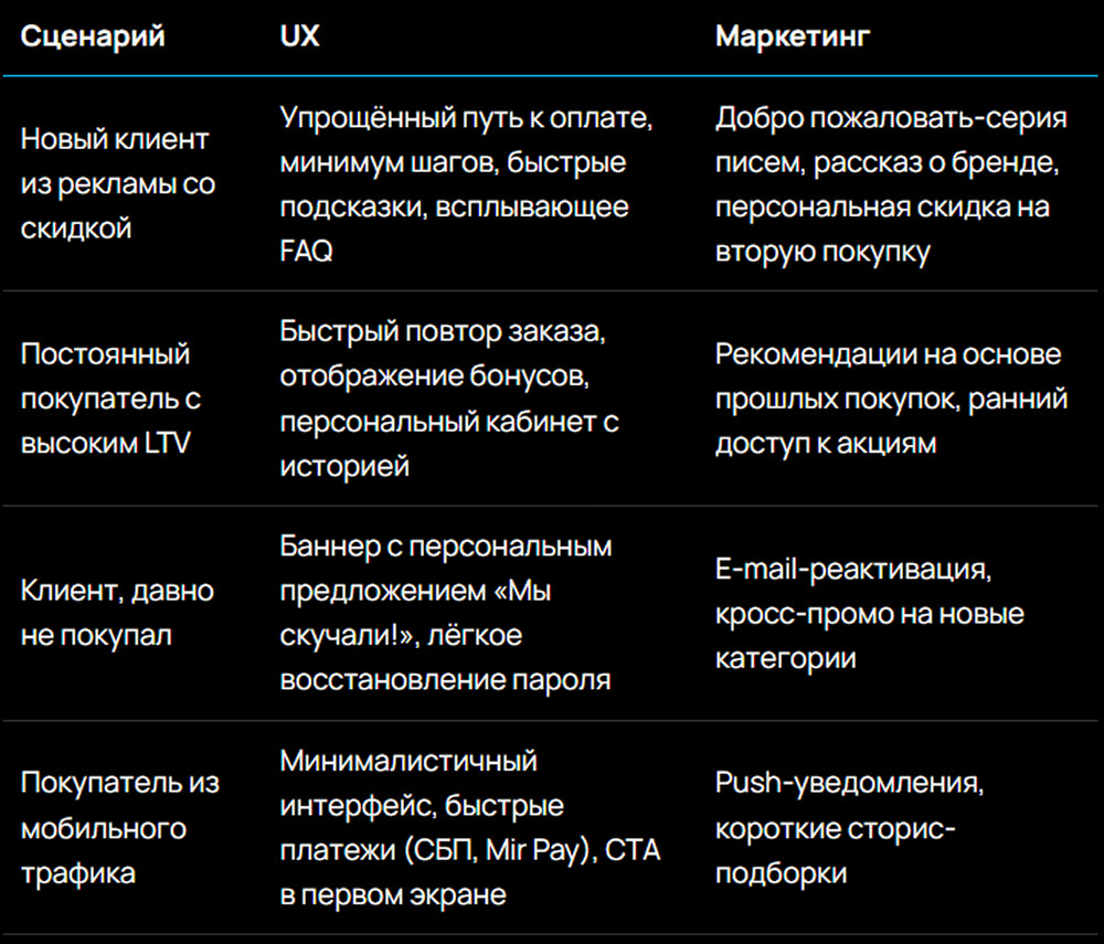 Эти параметры задают не только стратегию коммуникации, но и UX: путь пользователя, карточку товара, фильтры, рекомендации и даже тексты CTA.
