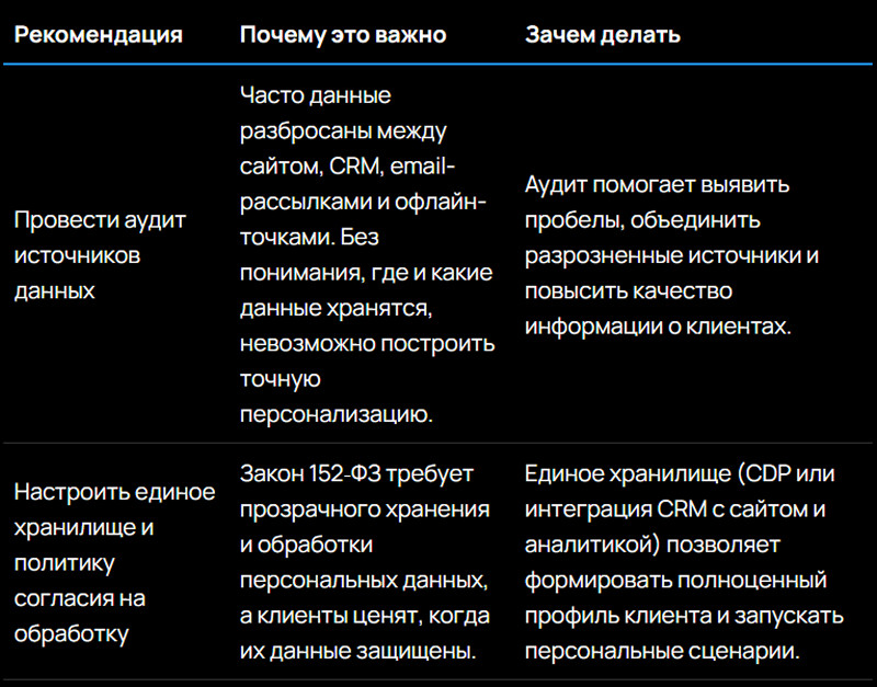 3. Умный ремаркетинг и кросс-продажи Если клиент купил определённый товар, на основе first-party data можно выстроить логичные цепочки рекомендаций. Например, клиент купил станок для лазерной резки — ему можно предложить сервисное обслуживание, расходные материалы и онлайн-обучение персонала. Такие сценарии: 1. Создайте доверие Прозрачность — это основа. Пользователь должен понимать, зачем вы собираете данные. Добавьте пояснение в форму подписки: «Мы используем ваши данные, чтобы предлагать только релевантный контент и не тратить ваше время на лишние рассылки.» 2. Централизуйте данные Разрозненные базы мешают персонализации. Используйте CDP (Customer Data Platform); централизуйте данные, интегрируя CRM, CMS и аналитические системы, чтобы формировать единый профиль клиента и строить персональные сценарии. 3. Настройте аналитику на основе реальных действий Переходите от поверхностных метрик (CTR, показы) к поведенческим — глубина просмотра, путь пользователя, частота взаимодействий. Так вы сможете создавать персонализированные рекомендации, основанные на реальных потребностях. 4. Автоматизируйте персонализацию Современные платформы (например, Bitrix24, Mindbox) позволяют: Компания, занимающаяся продажей промышленного оборудования, интегрировала CRM с сайтом и системой email-маркетинга.Что изменилось: Результаты за 3 месяца: Будущее маркетинга — за умной, этичной и технологичной персонализацией. Мы считаем, что компании, которые сегодня научатся эффективно работать с first-party data, смогут не только управлять вниманием своей аудитории, но и заметно повысить конверсию, удержание клиентов и LTV. Это подтверждается нашей практикой: мы видим, что после внедрения персонализированных решений, автоматизации и интеграций через веб-разработку клиенты фиксируют рост конверсии, увеличение среднего чека и снижение оттока.