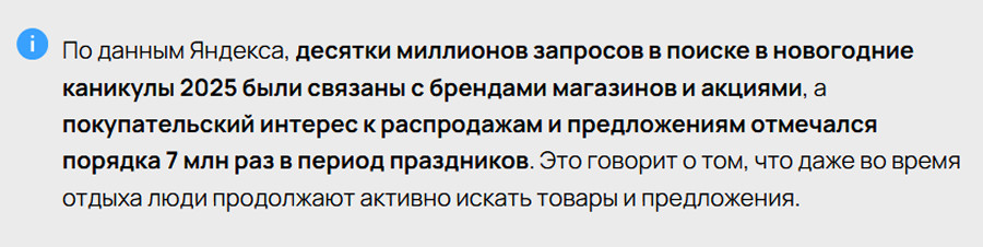 - повышенное число поисковых запросов о брендах, магазинах и праздничных распродажах: миллионы таких взаимодействий еженедельно фиксируются в поисковых системах в январе.