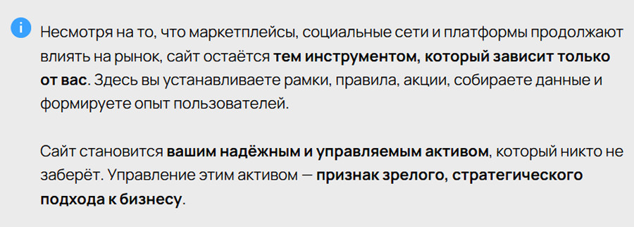 Они не ведут пользователя к решению, не формируют опыт, не помогают принимать решение. Такие сайты становятся справочниками: они видимы, но не влияют на конверсии и не создают ценности.
