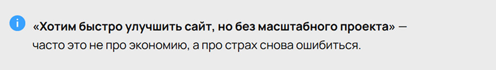 Наша практика показывает: за просьбой «Хотим быстро улучшить сайт, но только без масштабного проекта» часто скрывается не рациональная экономия, а страх повторить прошлые ошибки, недоверие к подрядчикам и желание не оказаться крайним.