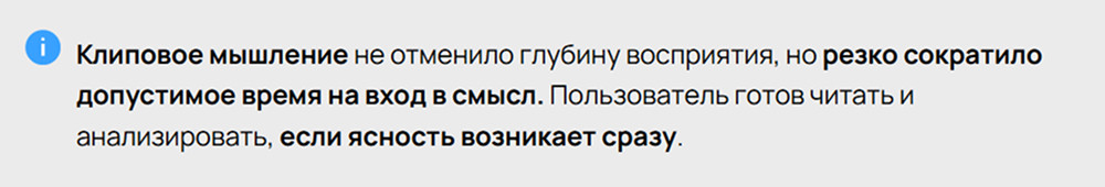 - Скорость понимания становится фактором конкурентоспособности. Ваш сайт либо за первые секунды вводит пользователя в ценностный сценарий, либо не участвует в конкурентной борьбе. Продажи ускоряются за счёт сокращения времени на объяснение ценности. Архитектура сайта становится точкой входа в воронку.