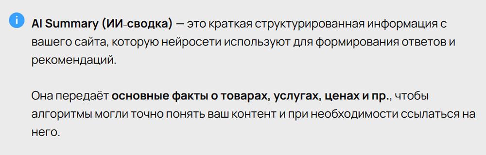 Нейросети любят готовые лаконичные факты. Чем яснее и структурированнее сводка, тем выше вероятность, что ваш контент попадёт в ответ.