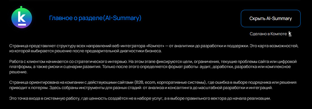 Для корпоративного сайта AI-Summary лучше строить вокруг позиционирования, услуг, отраслей, географии и основных сценариев использования. В начале страницы стоит дать короткое определение: кто вы, что делаете и какой результат получит клиент. Хорошая формула для B2B-страницы: [Компания] помогает [аудитории] решать [задачу] с помощью [продукта/услуги], чтобы получить [измеримый результат]. Это удобно и для человека, и для AI-понимания, потому что сразу задаёт тему, роль и ценность. Для карточки товара AI-Summary должен отвечать не на «что у нас есть», а на «какую проблему закрывает этот товар». Лучше всего работают короткий lead-абзац, список ключевых характеристик и блок частых вопросов по размеру, совместимости, доставке, гарантии и возврату. Для категории товаров AI-Summary должен объяснять логику выбора: кому подходит категория, на какие параметры смотреть, чем отличаются подтипы и какие фильтры важны. Это помогает AI не просто увидеть каталог, а понять пользовательский намеренный запрос. ✖️ Плохо: «Мы предлагаем комплексные digital-решения для современного бизнеса.» ✅ Хорошо: «Мы создаём и интегрируем сайты для B2B-компаний, которым важно получать лиды из поиска и быстро масштабировать продажи. Основной фокус — SEO-структура, интеграции и конверсионная архитектура, которая снижает стоимость привлечения клиента» Такой вариант лучше работает для AI, потому что в нём есть тип компании, услуга, аудитория и результат. «Беспроводные наушники XYZ подходят для ежедневного использования, звонков и поездок. Модель поддерживает шумоподавление, работает до 30 часов без подзарядки и доступна в трёх цветах. На странице есть информация о совместимости, доставке и гарантии.» Это снижает неопределённость для пользователя и помогает нейросети точнее сопоставить товар с запросами вроде «наушники для звонков с шумоподавлением». «В этой категории собраны CRM-системы для малого и среднего бизнеса. При выборе важны стоимость, интеграции, автоматизация продаж, аналитика и удобство внедрения. Ниже можно сравнить решения по функциональности и модели оплаты.» Это помогает нейросети связать категорию с задачей выбора. AI-Summary можно увидеть и на нашем сайте. На основных страницах мы применили подход, о котором говорим: каждая страница содержит краткий, структурированный блок смысла, который сразу задаёт тему, аудиторию и ценность услуги. Например, на странице услуг вы можете увидеть: