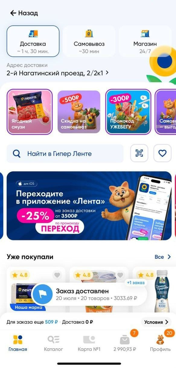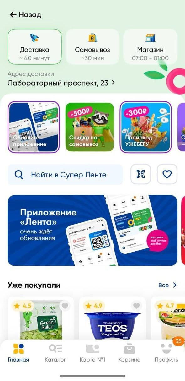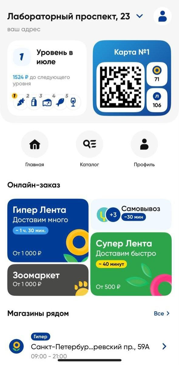 На главной странице появился доступ к выбору формата: «Гипер Лента», «Супер Лента», «Зоомаркет», «Вингараж» и «Эконом». Новая версия приложения определяет геолокацию клиента и предлагает ему на выбор магазины, которые находятся рядом. Благодаря этому снизился процент отмены самовывоза и увеличилось количество заказов из магазинов малых форматов. Обновленная версия приложения доступна в App Store и RuStore.