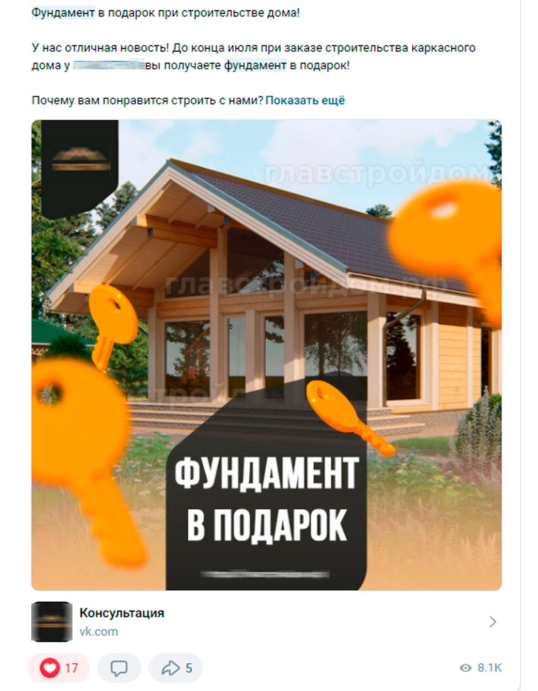 Контент создавался вокруг нескольких ключевых офферов, которые привлекали внимание клиентов:1. Фундамент в подарок;2. Дизайн-проект в подарок;3. Ремонт в подарок;4. Бесплатная консультация.