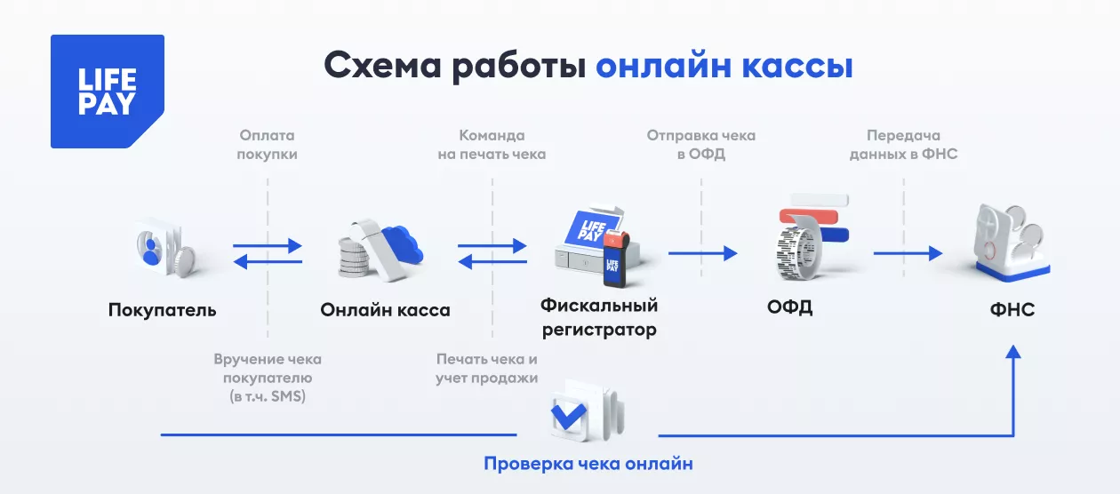 Общая схема работы онлайн-кассы — на картинке ниже. Итак, разбираемся поэтапно: 1. Как только клиент оплачивает покупку, кассовое устройство фиксирует информацию и мгновенно передаёт её в ОФД. 2. ОФД подтверждает данные о сделке и отправляет уникальные реквизиты на кассовый аппарат для формирования чека. 3. Касса формирует чек (бумажный либо электронный талон с размером суммы платежа за товар) и даёт команду принтеру на печать чека. 4. Одновременно Федеральная налоговая служба получает данные от ОФД о покупке и фиксирует их у себя. 5. Покупатель получает чек в бумажном виде, по почте или СМС. Он в любой момент может проверить подлинность транзакции через налоговую, которая подтвердит легальность сделки. Подобная череда операций имеет большое значение — в первую очередь для прозрачности торговли. Термин «непрозрачная торговля» тесно связан с понятием «серой экономики» — ситуацией, когда денежный и товарный обороты не контролируются государством. Доходы предпринимателей, которые занимаются подобной деятельностью, не облагаются налогами. По данным Росстата на 2017 год (период введения онлайн-касс в России), объём теневой экономики составлял примерно 13% от ВВП страны. Это был не катастрофический, но довольно проблемный показатель. Отчётность перед налоговой, которую как раз и передают по цепочке касса и ОФД, фиксируется в ФНС. По сути, государство наблюдает за тем, как проходит торговля в разрезе юридического лица торговой точки, наименований и количества проданных товаров, прибыли, которую получает собственник. Чек, который выдаётся покупателю, — своеобразный гарант равносторонней сделки. По нему клиент может не только осуществить возврат товара, но и законно подтвердить собственные траты. Лишать своего клиента чека — дурной тон и административное правонарушение: для юридического лица может быть назначен штраф в размере 10 000 ₽. Кассовые аппараты встречаются в нескольких модификациях: 1. В составе смарт-терминала 3-в-1 — устройство, которое одновременно принимает платежи, отправляет данные в ОФД и ФНС и печатает чек. Часто используется малым бизнесом и при мобильной торговле. 2. Автономные кассы, похожие на кнопочные калькуляторы — небольшого размера и весьма компактные, но не могут работать без подключённого компьютера с установленной кассовой программой. 3. Фискальные регистраторы — устройства, которые соединяют в себе фискальный накопитель для обработки и передачи данных и устройство, печатающее чеки. Также работают во взаимодействии с кассовой программой. 4. Стационарные кассы (моноблоки или комплексные POS-системы) — полностью оборудованное рабочее место кассира. Включает в себя монитор, клавиатуру, сканер, принтер чеков и другие устройства. Часто используется в ресторанах, торговых сетях. ☁ Особый вид онлайн-кассы, который стал популярен в последние несколько лет, — облачная касса в виде удалённого цифрового накопителя. Ниже расскажем, в каких случаях облачная касса — более экономный вариант кассы для вашего бизнеса. Облачная касса представляет собой удалённый фискальный накопитель, который собирает информацию о сделках торговой точки с нескольких терминалов оплаты в свои базы данных. ✅ Главное преимущество облачной фискализации — для неё не нужно покупать какое-либо кассовое оборудование. Достаточно лишь аре