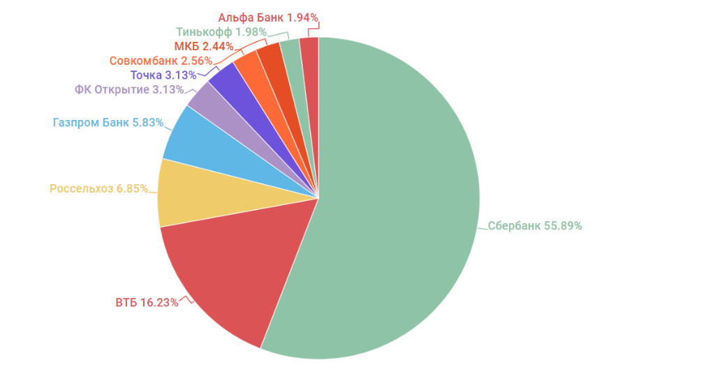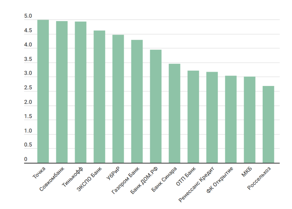Существует большое количество рейтингов банков РФ, но нами были проананализированы два самых важных критерия: количество открытых вкладов и доверие пользователей. В критерии «Количество открытых вкладов» ожидаемо лидирует Сбербанк (это показано на первом графике) с суммарным вкладом свыше 9 млрд рублей. Однако выбор пользователей — это банк ПАО «Точка», сфокусированный на предоставлении услуг для юридических лиц (ориентируйтесь на 2 график). Данные составлены согласно отчетам сайта Сравни.ру
