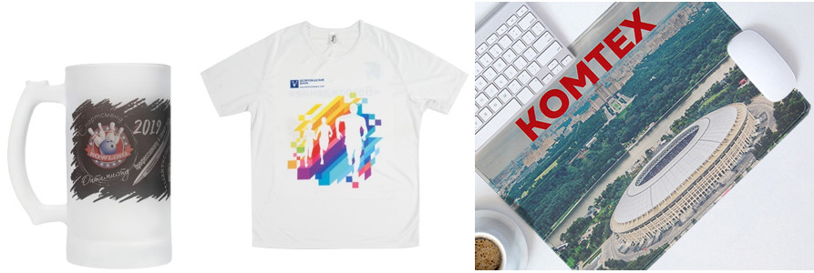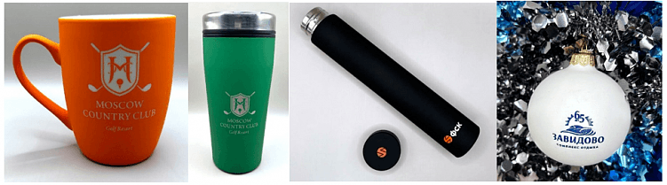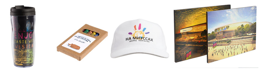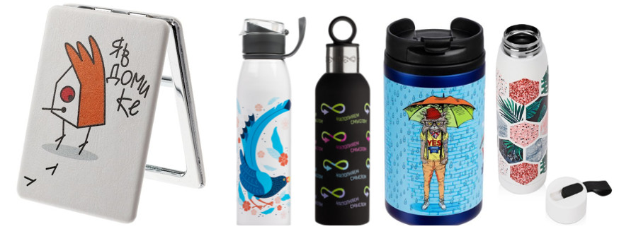 термосы, термокружки и пр. сувениры. Изображения получаются фотореалистичнее по сравнению с шелкографией, но только на светлых поверхностях. Срок от 5 дней, тираж от 500 до 5000 штук.