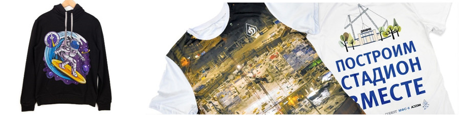 для нанесения полноцветных изображений на изделия из текстиля из натуральных и искусственных волокон, кожу, различные виды полимерных покрытий. Благодаря использованию белого цвета при печати доступен как на белых, так и на цветных поверхностях. Срок изготовления от 7 дней, тираж от 500 до 5000 штук.