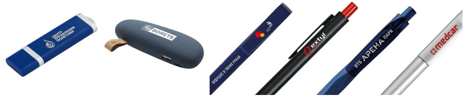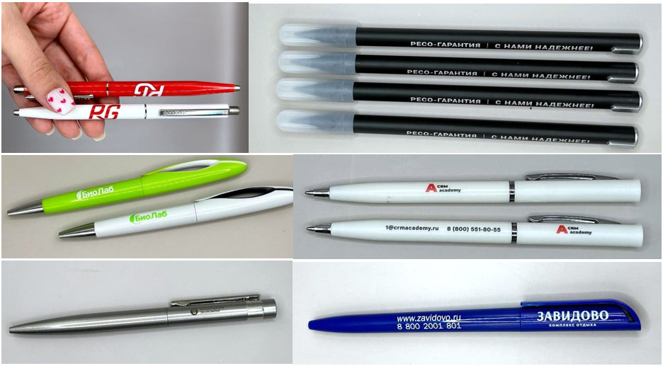 Для ручек и пр. канцелярии: Точная цветопередача — УФ-печать, тампопечать (Pantone). Стойкое нанесение — тампопечать, шелкография, УФ-печать. WOW-эффект — лазерная гравировка. Быстро: лазерная гравировка, УФ-печать. Выгодно: шелкография, тампопечать. Проморучки
