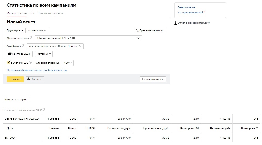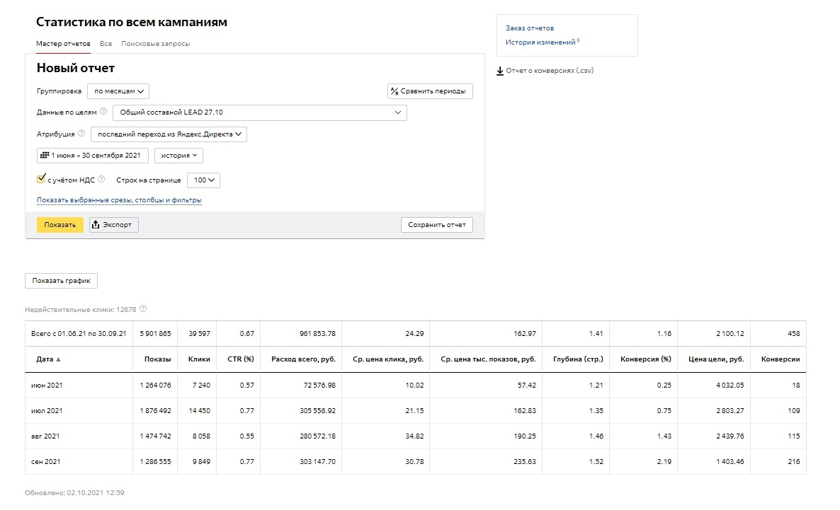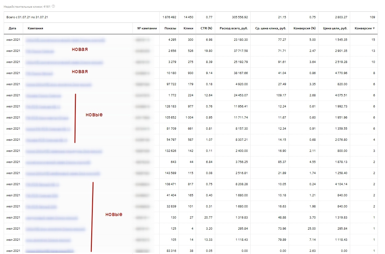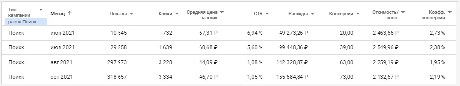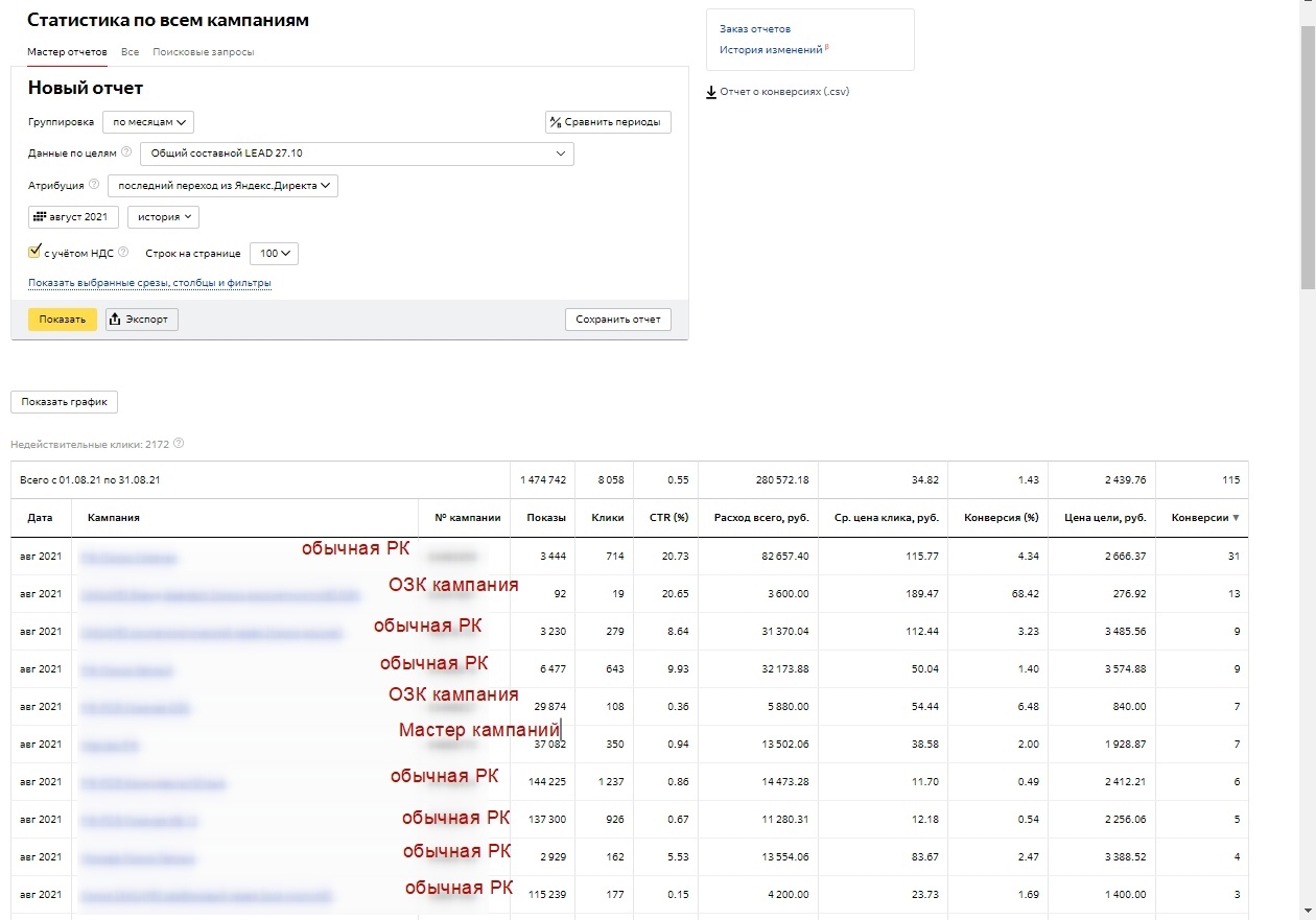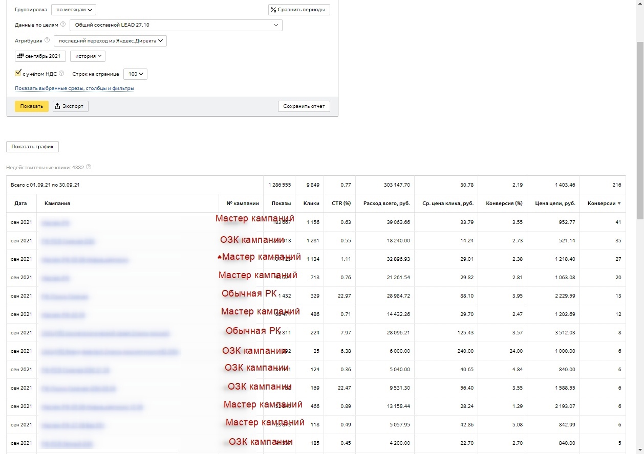 А потом клиенты возвращаются поняв что с данным спецом/командой приятно, а самое главное эффективно работать. Так вот, я возьму последний срез (4 месяца), так как за последнее время очень много всего поменялось в контексте (особенно в Яндекс Директ), так что цифры до этого периода по сути будут уже не сильно актуальны. И кстати 2100 руб. цена лида в заголовке — это средняя цена за все 4 месяца, а к последнему месяцу мы снизили цену лида до 1400 руб. в Яндекс Директ. В данном кейсе я не буду особо расписывать про Google Ads, так как он работает более стабильней чем Яндекс Директ. Но я затрону один важный момент, если посмотреть на скриншот по гуглу — мы увидим что в августе и сентябре сильно падает CTR, вырастают показы и увеличивается количество конверсий почти в 2 раза, однако цена за конверсию падает. У нас работают только поисковые кампании, так как сколько мы не тестили КМС в рамках отдельных кампаний — то они показывают не очень хороший результат, поэтому мы сделали другую вещь, распишу о ней немного позже. И так, мы в общем массе ведем 4 сайта у данного клиента, но я взял только 1 сайт для кейса так как он самый «жирный». Обращения с сайта не дороже 3000 рублей. Яндекс Директ — 300.000 руб. в месяц. Google Ads — 150.000 руб. в месяц. Планируем с октября потихоньку увеличивать бюджет. Июнь у нас отрабатывал на старых кампаниях, там только-только был новый запуск после возвращения клиента, поэтому кампании потихоньку разгонялись. Еще мною было принято решение поменять специалиста по ведению данного клиента, так как я хотел потестить разных спецов из своей команды, потому что вижу сильные и слабые стороны своих ребят. Бывает такое что человек может выгореть в одном проекте и его эффективность падает, грубо говоря спеца немного начинает тошнить от проекта — соответственно и результат проекта начинает постепенно ухудшаться. Но я как руководитель — вижу что происходит с каждым человеком в моей команде, поэтому бывает что и меняю вектор развития специалистов, направляю их на другие вещи чтобы они развивались дальше, а не сидели на одном месте. Пока июнь у нас был разогревочным, то в июле мы начали собирать новые кампании под «новые реалии» Яндекс Директа. В тот период очень сильно начали проседать РСЯ, поэтому было принято решения пересобрать все рекламные кампании немного по другому + использовать кампании с оплатой за конверсии и автостратегиями. Мы оставили только те старые кампании, которые приносили результат в рамках KPI и провели в них безжалостную чистку по площадкам, ключам, объявлениям и тд. В июле после создания новых рекламных кампаний + чистки и остановки старых кампаний мы стали собирать статистику и снова отключать всякий мусор. На тот момент сильного понимания куда двигаться не было, так как РСЯ жестка «качало» и то лиды были, то опять пропадали без причины. В целом июль мы закрыли уже неплохо. В 6 раз увеличили количество обращений и снизили цену лида. Бюджет конечно уже вырос, но так и было задумано. Общая статистика: Статистика по кампаниям: В августе по сути мы закрепили результат. Так как в июле пошли конверсии — то начали раскручиваться и кампании с оплатой за конверсии (ОЗК кампании). Они прямо хорошо начали работать + мы приступили к тестовому запуску мастеров кампаний. Общая статистика за Август: Статистика по кампаниям за Август: Самый интересн