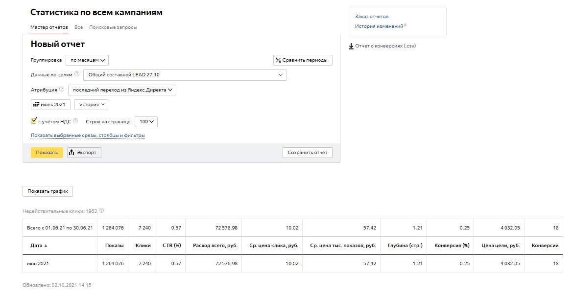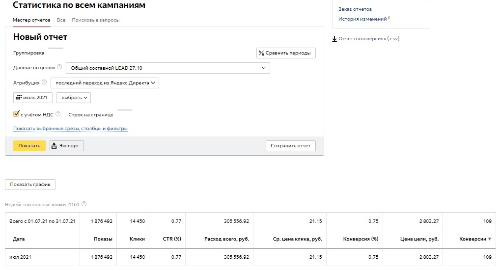 Я продвигал одну компанию в Яндекс Директ и Google Ads по поставкам Лазерного оборудования по всей РФ. Все было в целом окей — но примерно в начале мая 2021 клиент решил «потестить» другую команду по продвижению, поэтому пришлось тормознуть рекламу.