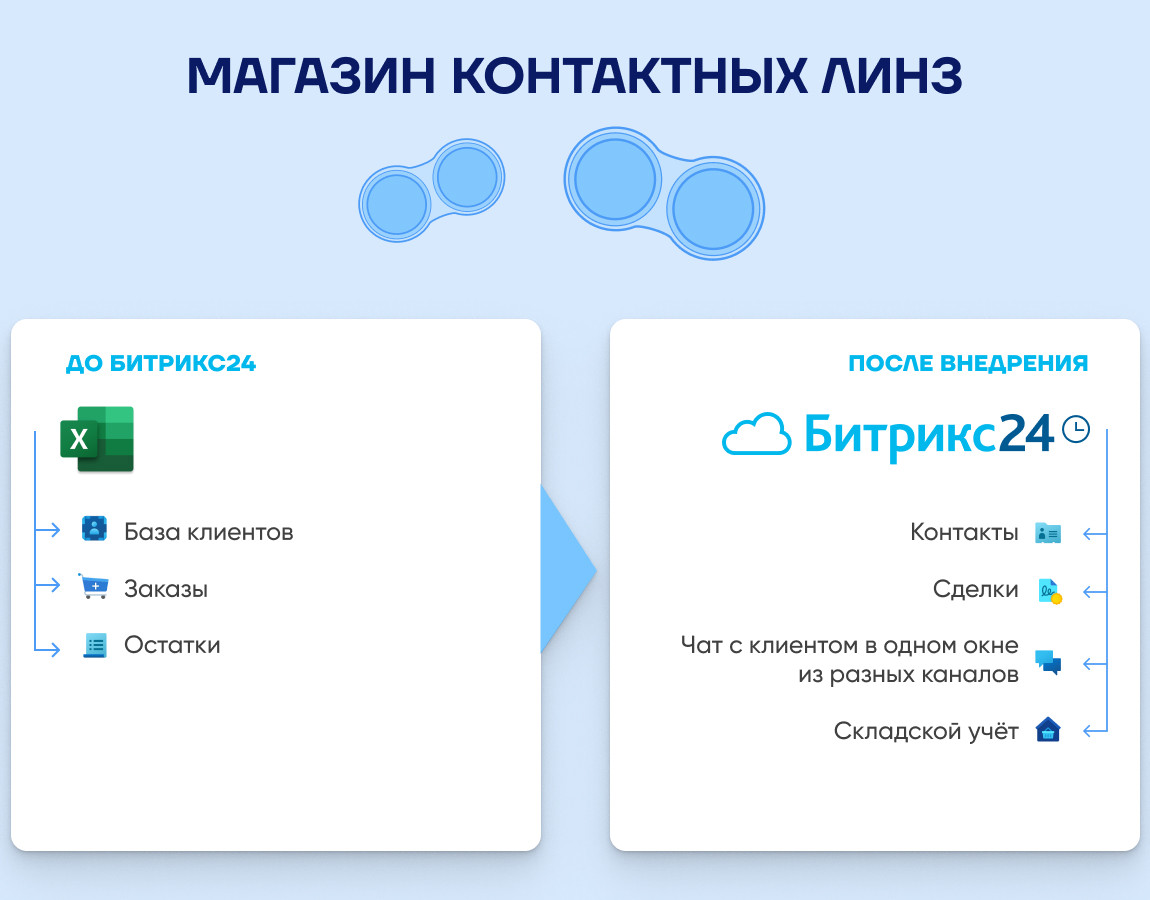 Команда «Логемы» реализовала настройку бизнес-процессов в Битрикс24 для интернет-магазина линз за 3 часа. Были автоматизированы четыре основных направления.