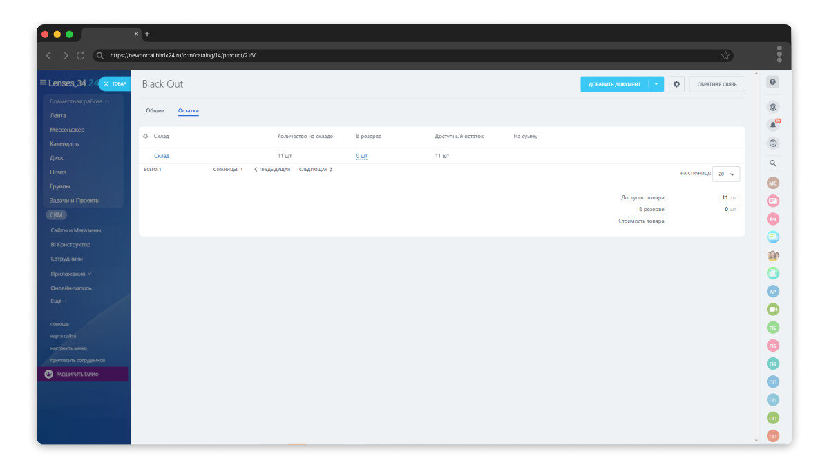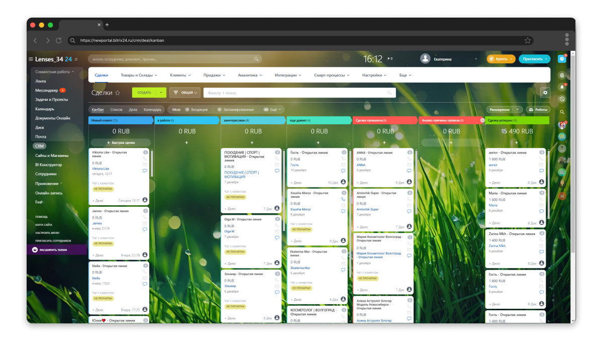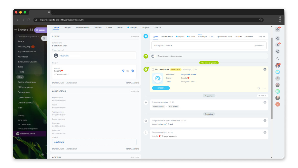 Если заказ оформляет новый клиент, информация о нём автоматически попадает в CRM Битрикс24. В дальнейшем менеджер может запускать рассылки по сегменту для «дожима» клиентов. Например, предлагать скидку тем, кто ещё думает, заказывать или нет. При получении сообщения от клиента создается карточка Сделки. Далее карточку двигает менеджер по стадиям до продажи («Сделка успешна»), либо проигрывается как неуспешная сделка. Менеджер наглядно видит, с каким клиентом необходимо связаться, а какому — предложить скидку на понравившийся товар, чтобы убедить в выгоде покупки. Роботы и триггеры не были настроены, но не исключено, что в будущем реализуется система уведомлений для прогрева клиентов и увеличения конверсии. Теперь, когда появляется новый комментарий под постом или клиент пишет в Директ Instagram*, у менеджера в Битрикс24 появляется сообщение в текущем диалоге или создается новый чат. Дополнительно к сообщению можно прикрепить фото и видео — прямо из Битрикс24. Теперь клиент использует CRM с возможностью кросс-канального ответа из соцсети и мессенджеров. Все входящие и исходящие сообщения отображаются в Открытых Линиях CRM-системы. Вся история переписки из разных каналов храниться в Битрикс24. При заказе товара, увеличивается количество единиц в резерве и уменьшается на складе. Автоматизация складского учета позволяет контролировать остатки, оперативно заказывать недостающие товары и исключить вероятность продажи товара, которого нет в наличии. За 3 часа команде «Логемы» удалось перенести менеджмент бизнес-процессов интернет-магазина линз @lenses_34 в Битрикс24. Клиент получил экосистему, в которой: Эти результаты удалось достичь в первый месяц использования Битрикс24. В планах расширение каналов продаж, тестирование новых маркетинговых инструментов, настройка дополнительного функционала бизнес-процессов: *Примечание: Instagram принадлежит компании Meta, признанной экстремистской и запрещённой на территории РФ